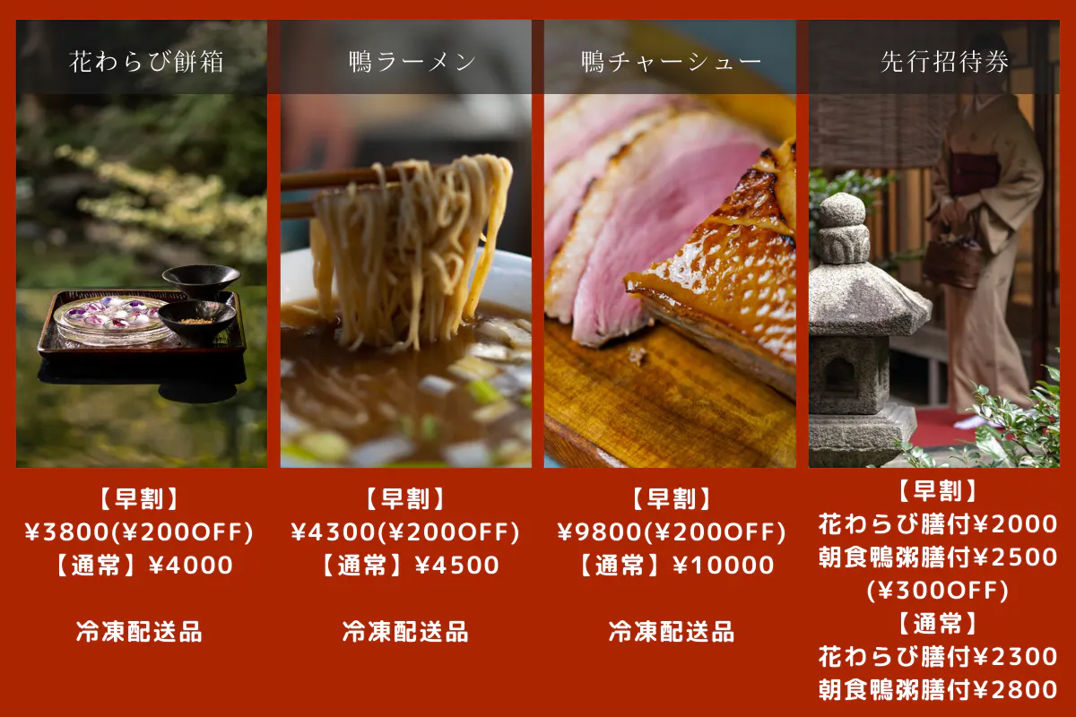 2500円のプランは花わらび餅となっていますが、鴨粥の間違いでしょうか?