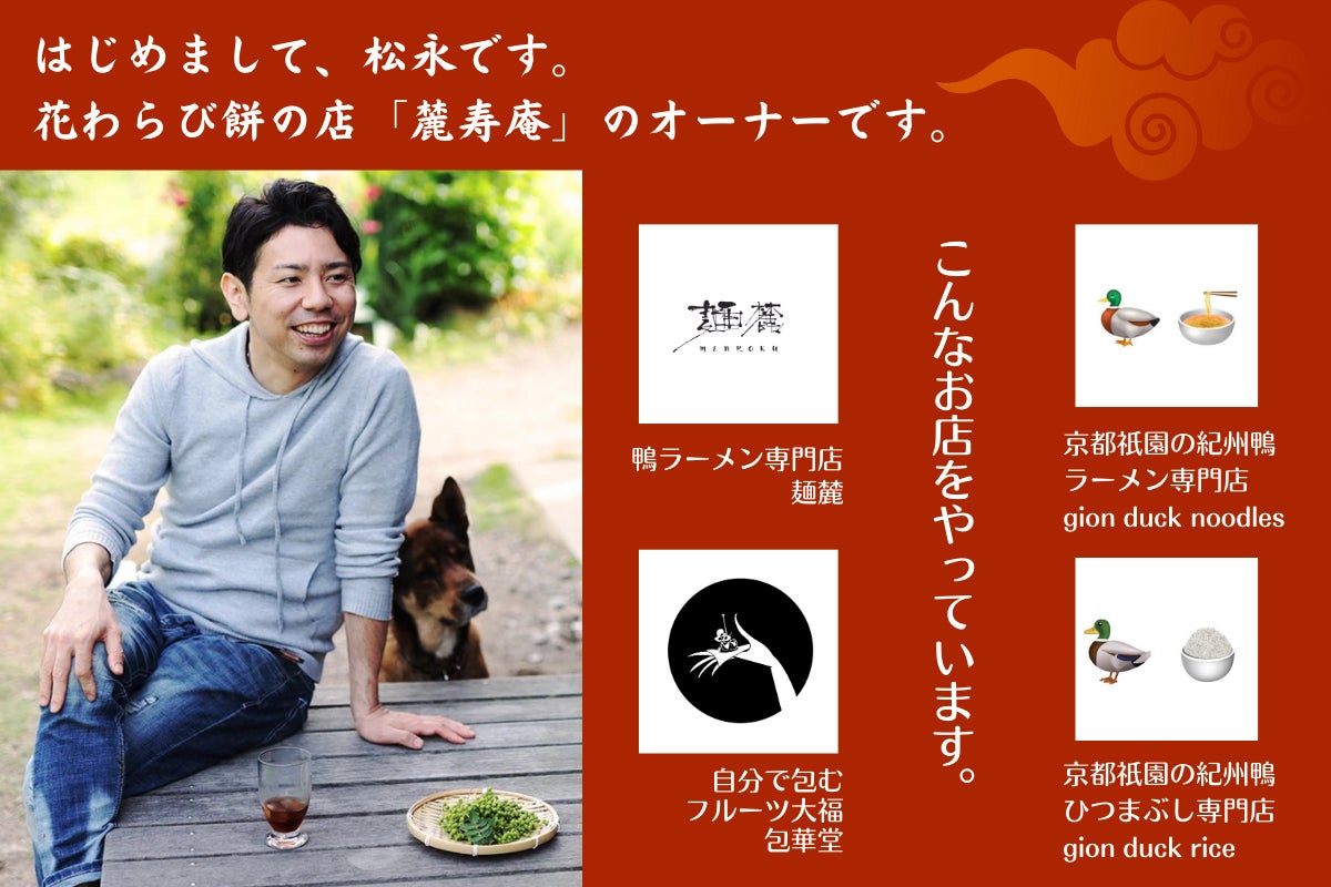 フレンチ出身でラーメン屋経営、インドネシアでもラーメン店を経営したこともあるという少し変わった経歴があります。現在は、紀州鴨を素材にしたつけ麺・ラーメンの店「麺麓」「Gion Duck Noodle」や、紀州鴨ひつまぶしの店「Gion Duck Rice」、手包みで楽しむフルーツ大福の店「自分で包むフルーツ大福 包華堂」を経営しています。