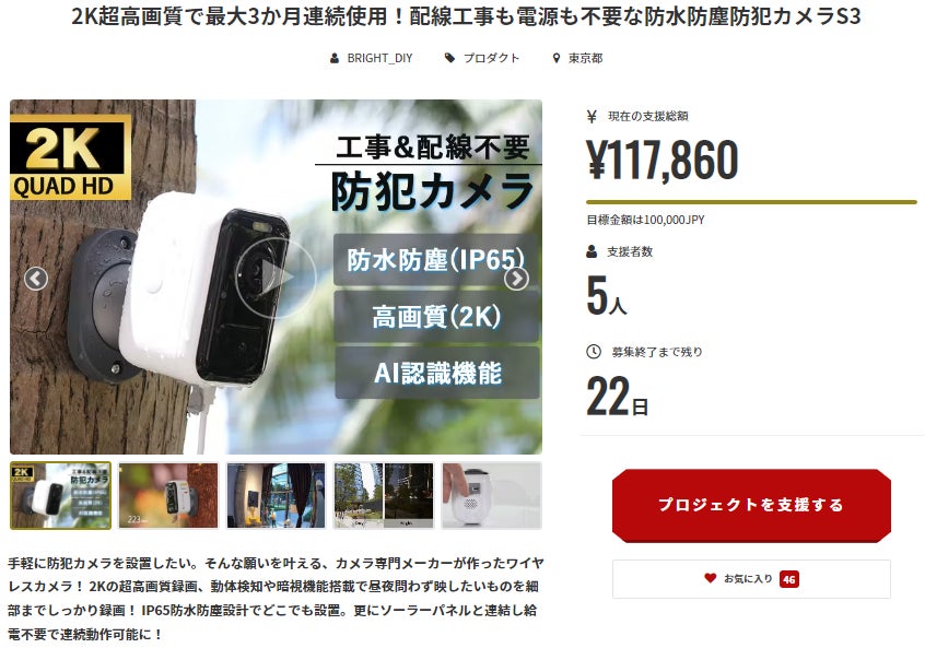 この度は「2K超高画質で最大3か月連続使用!配線工事も電源も不要な防水防塵防犯カメラS3」に支援して頂き、ありがとうございます!