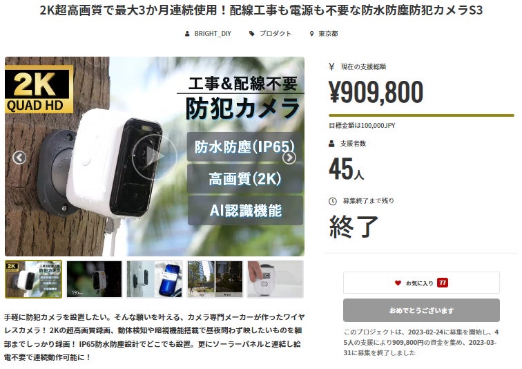 皆様にご満足いただけるリターンをお届けできるよう、全力で取り組んで参りますので引き続き、「2K超高画質で最大3か月連続使用!配線工事も電源も不要な防水防塵防犯カメラS3」をよろしくお願い致します。