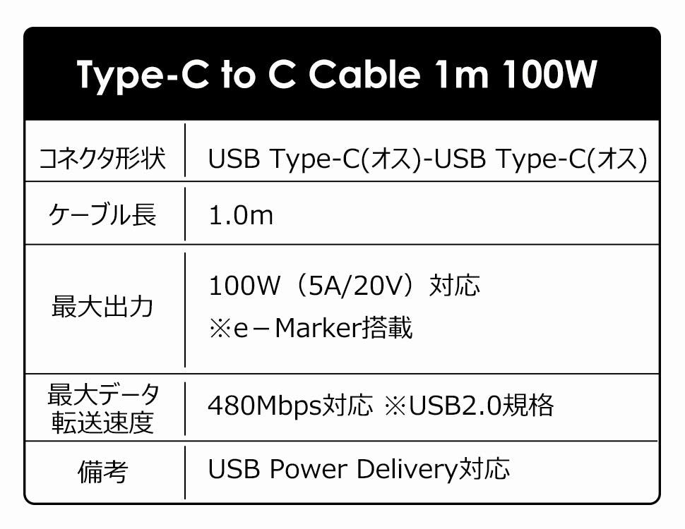 Type-C(オス)-Type-C(オス)のケーブルです。上下対照の形ですのでリバーシブルにお使いいただけます。スマートフォンやタブレット端末、ノートPCなどのUSB-C機器に最大出力100W(5A/20V)の急速充電をサポートします。