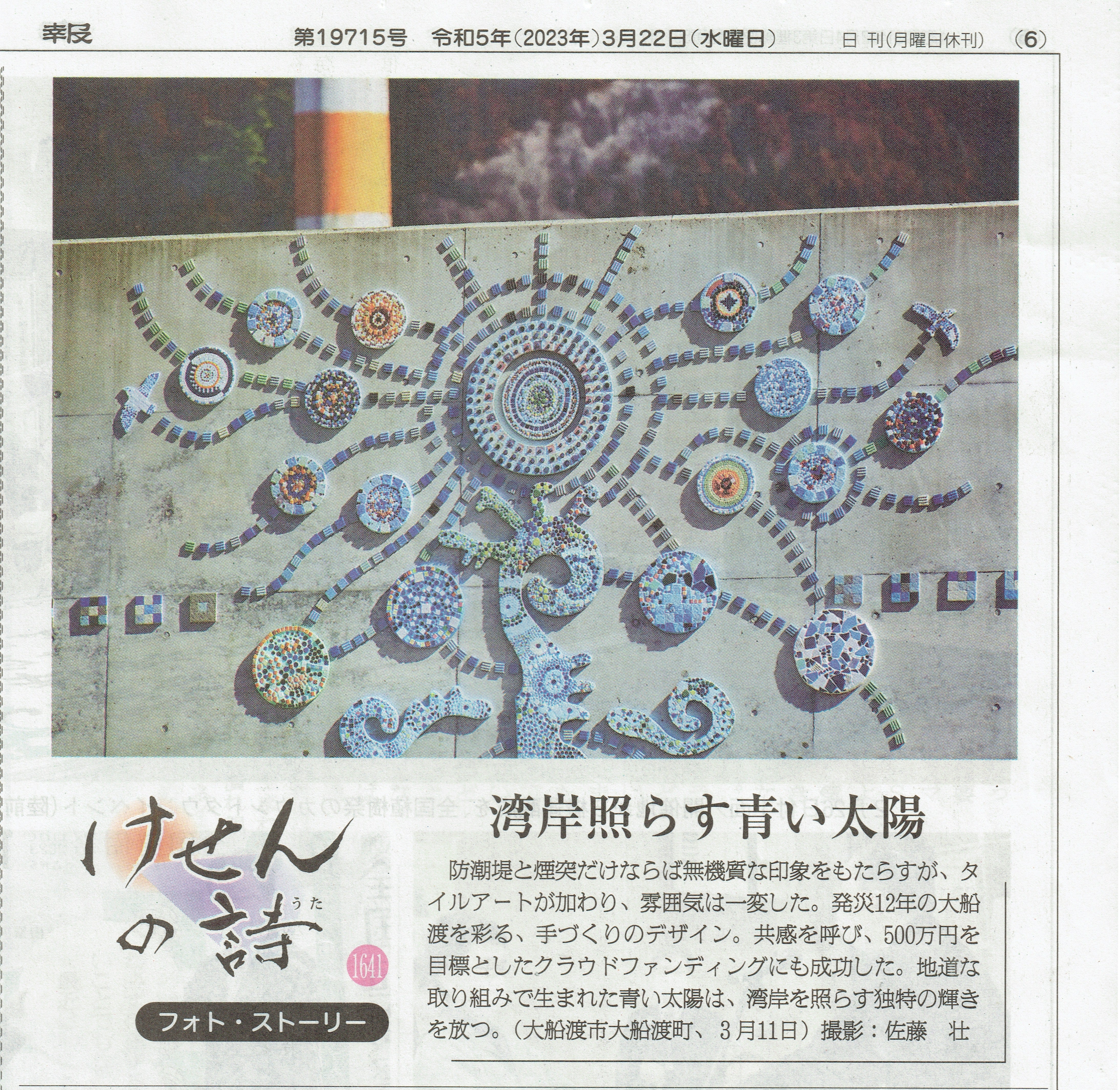 実は先日、コープ共済赤いクマさんのキャラクターでお馴染み「コーすけ」がブルーラインを見に来てくれました!遠いところ大船渡まで来てくれたコーすけと事業事務局みんなのしるしの本間がお話させてもらいました。そして、その様子が本日YouTubeチャンネル「みやぎ生協コーすけ」にて公開されましたので文末URLより是非ご覧ください!最後にコーすけにもタイルを1枚貼ってもらいましたよ♪今回の展示は5月26日(金)までの予定です。4月27日〜30日にかけて新たに製作したモザイクタイル作品や刻印したタイルを設置予定ですので、ゴールデンウィークは是非大船渡・三陸沿岸観光へ!そして防潮堤のそばをゆっくりと歩いてみてください!<みやぎ生協コーすけ>モザイクタイルアートで「忘れない」をつなげるのだ(^^)https://youtu.be/cPCAOOIczY4