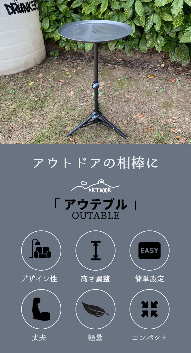 ARTDOORアウテブル (Outable)は、デザイン重視の持ち運びに便利な折り畳み式アウトドアテーブルです。デイキャンプ、ソロキャンプなどちょっとのんびりしたい時に使え、立ち飲みやローチェアなどの相棒になります。