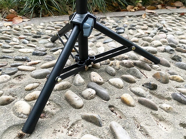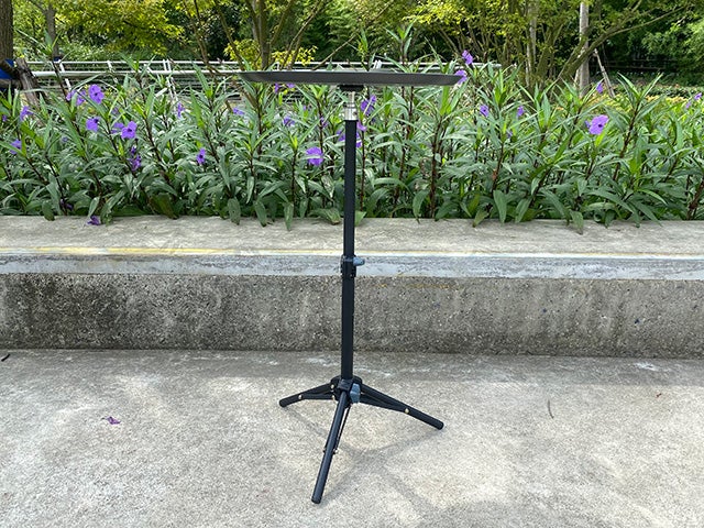 三脚の足底はしっかり安定して支えられるよう、二重構造になっております。耐荷重は約15Kg。とても重いものをのせても、主軸がしっかり地面で支えてくれるので特に問題ございません。