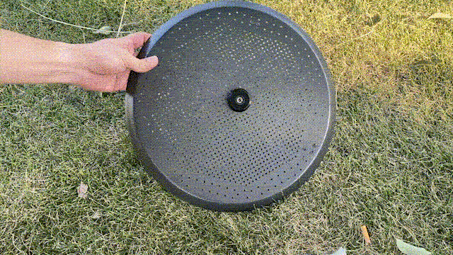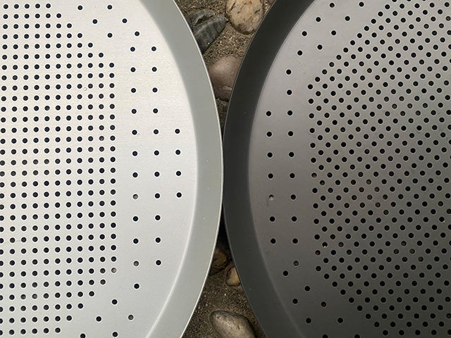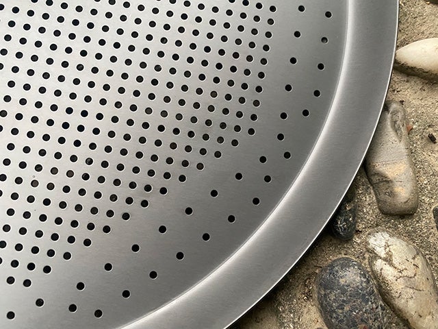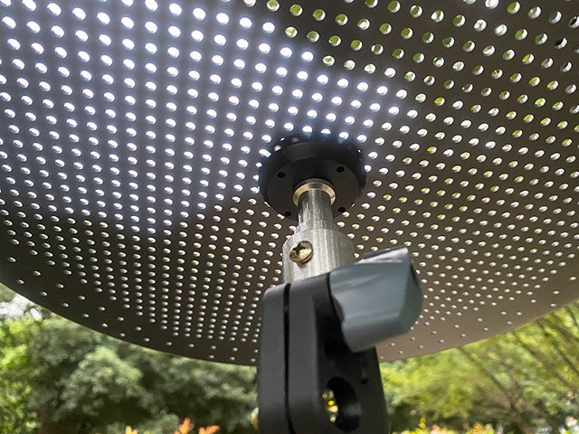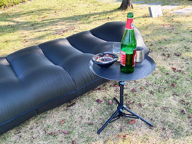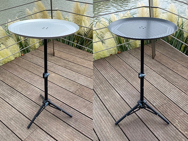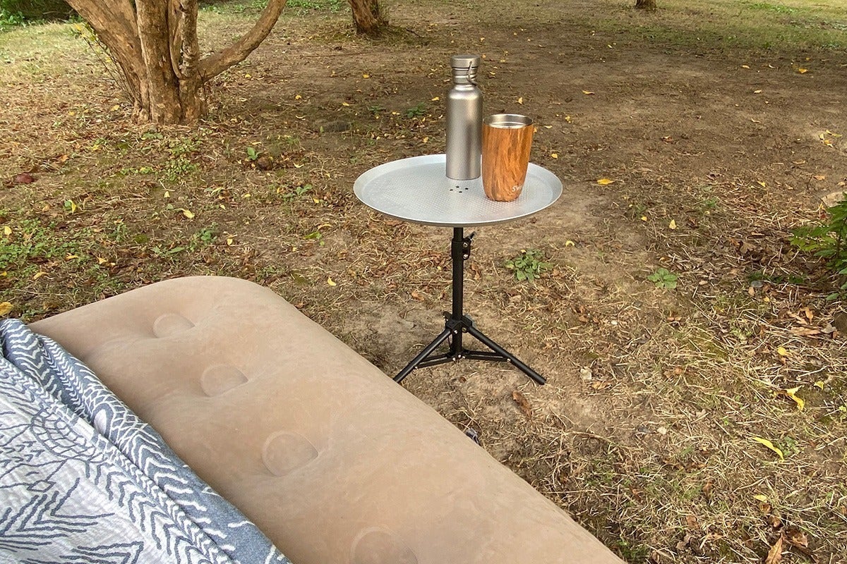 テーブルの天板は硬質アルマナイト処理をしているアルミニウム合金でできており、とても丈夫です。天板には小さなメッシュのホールが空いております。風通しが良く、アウトドアで万が一飲み物をこぼしても天板に水が溜まってびしょびしょになることはございません。※ インドアでご利用の際は、万が一飲み物をこぼして床がびしょびしょにならないようご注意ください。