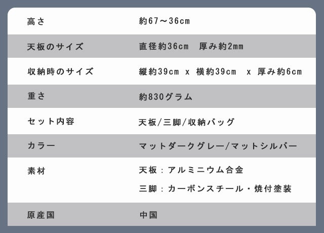 重さは約830グラム。とっても軽く、とてもポータブルです。さっと近くの公園、お庭、テラス、山や川辺などへ持っていきコーヒータイムやビールタイムを楽みませんか?