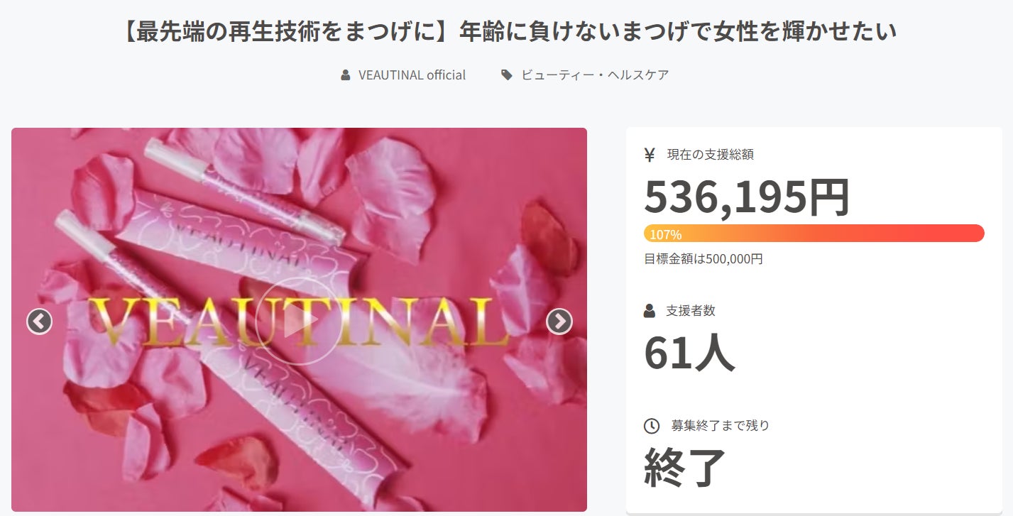 2023/05/04 18:00この度は弊社のまつげ美容液「VEAUTINAL」にご支援いただき誠にありがとうございました。おかげさまで達成率107%、支援総額536,195円という結果にてクラウドファンディングを終了させていただきました。ご支援の際にいただいたお一人お一人からのメッセージが温かく、心の支えとなりました。改めまして、スタッフ一同感謝申し上げます。皆様からのご支援は次期商品の開発資金として大切に使わせていただき、より良い商品をお届けできるよう尽力致します。尚、今後も進捗状況などをこちらに投稿させていただきますので、ご覧いただければ幸いです。その他、商品についてのお問い合わせは、公式Instagram「@veautinal_official」までお気軽に ご連絡ください。今後ともVEAUTINAL及び弊社を宜しくお願い申し上げます。 もっと見る