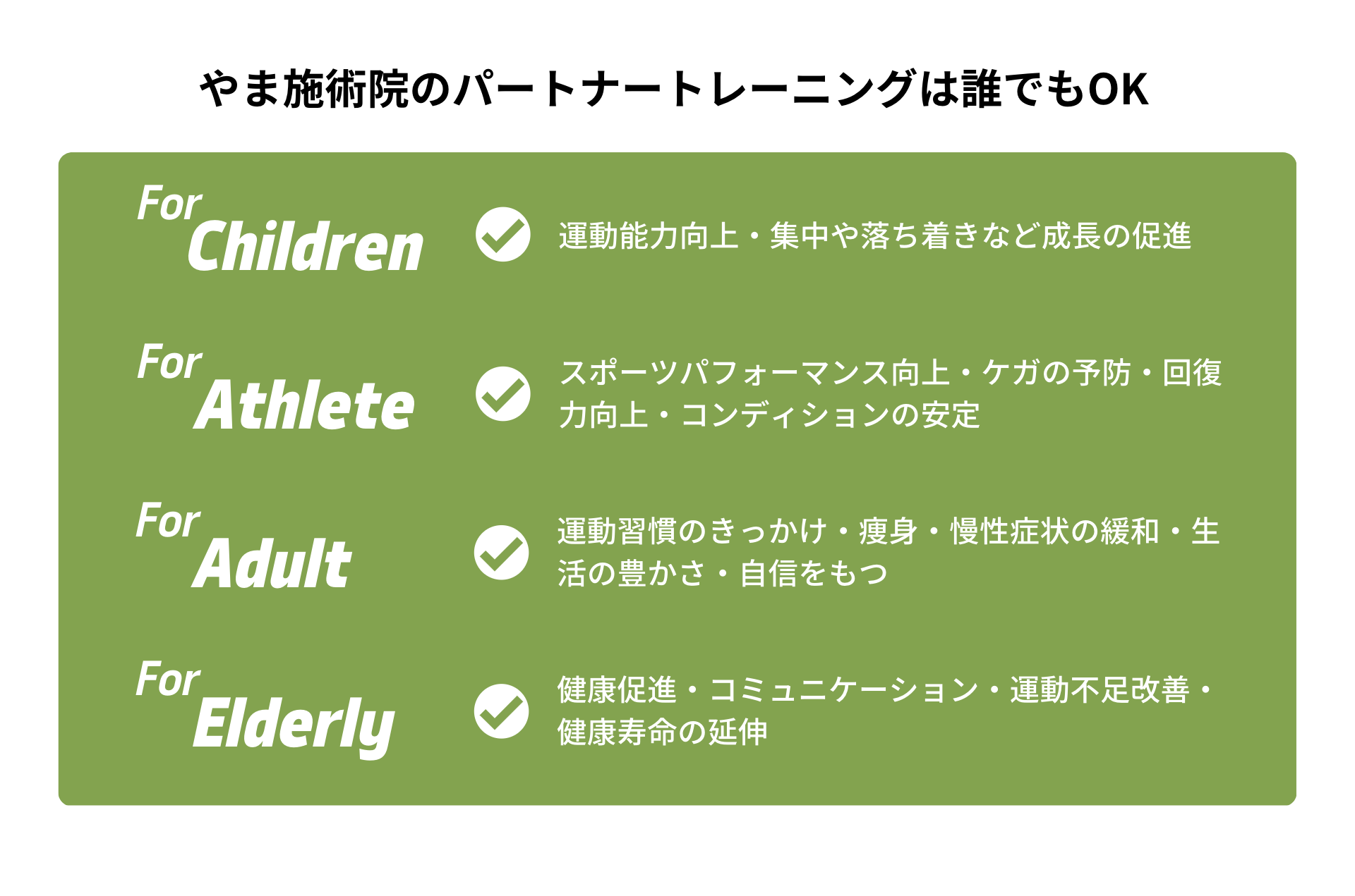 やま施術院が提供するパーソナルトレーニングは老若男女、スポーツの種類や経験問わず受けていただけます。