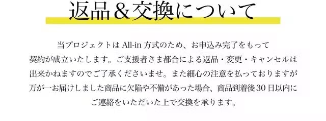 私たちは【シャルムジュエリー】を制作するために、工場とデザイン・仕様を実現できるよう、プロジェクトを誠心誠意進めています。 しかしながら開発中の工程において、デザイン・使用が一部変更になる可能性もございます。製造スケジュールについては、プロジェクト成功を想定した数で調整しておりますが、想定を上回る応援の申し込みがあった場合、製造や発送に伴うやむを得ない事情によりお届けが遅れる場合がございます。上記のようにプロジェクトページに記載している内容に変更がある場合は、活動レポートなどで共有を行っていく予定です。 本文中に記載させていただいたスケジュールは、あくまでプロジェクト公開時点の予定です。支援の性質上、配送遅延のおそれがございます。 原則として、配送遅延に伴う支援のキャンセルはできませんが、リターン配送予定月から3ヵ月を超えた場合には、希望者に限りキャンセルにて対応させていただきます。