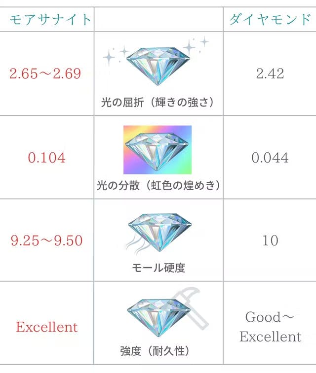 ファイアと呼ばれる光の分散(虹色の輝き)なども、ダイヤモンドに対して約2.5倍もあり、多くの面においてモアサナイトはダイヤモンドよりも優れていることがわかります。