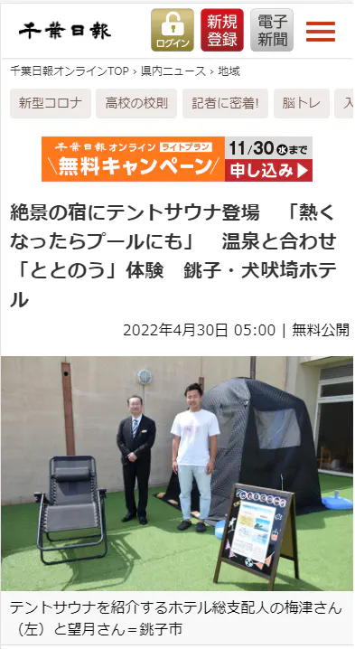 引用:絶景の宿にテントサウナ登場 「熱くなったらプールにも」 温泉と合わせ「ととのう」体験 銚子・犬吠埼ホテル