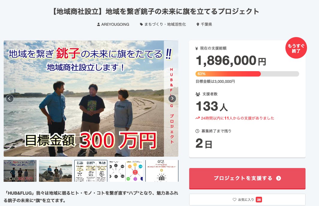 2025/12/28 17:33【クラウドファンディング終了まで、あと2日!】いつも本当にありがとうございます。クラウドファンディングが、いよいよ残り2日となりました。銚子市初となる「地域商社」を立ち上げ、地域をつなぎ、銚子の未来に旗を立てることを目標にスタートした本プロジェクト。おかげさまで、目標金額300万円まであと少しのところまで来ることができました。ここまで支えてくださった皆さまの応援、本当にありがとうございます!「今回初めてこのプロジェクトを知った」という方も、ぜひこの機会にプロジェクトページをご覧いただけると嬉しいです。残り2日、最後まで全力で走ります。引き続き、応援・シェアも大きな力になります!▼プロジェクトページはこちらhttps://camp-fire.jp/projects/view/877196どうぞ最後まで、よろしくお願いいたします もっと見る【2月27日銚子eGYMグランドオープン】