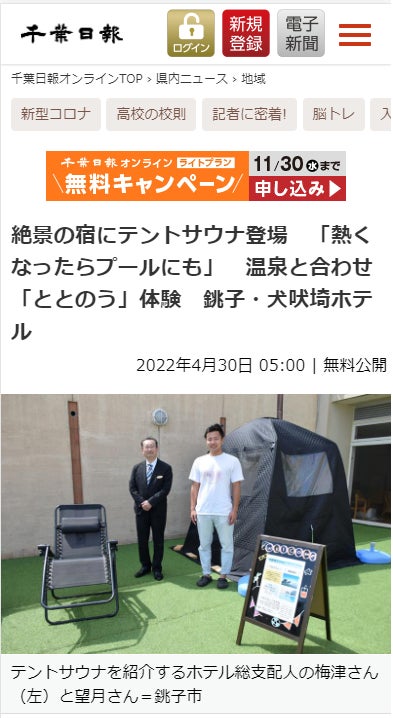 引用:絶景の宿にテントサウナ登場 「熱くなったらプールにも」 温泉と合わせ「ととのう」体験 銚子・犬吠埼ホテル