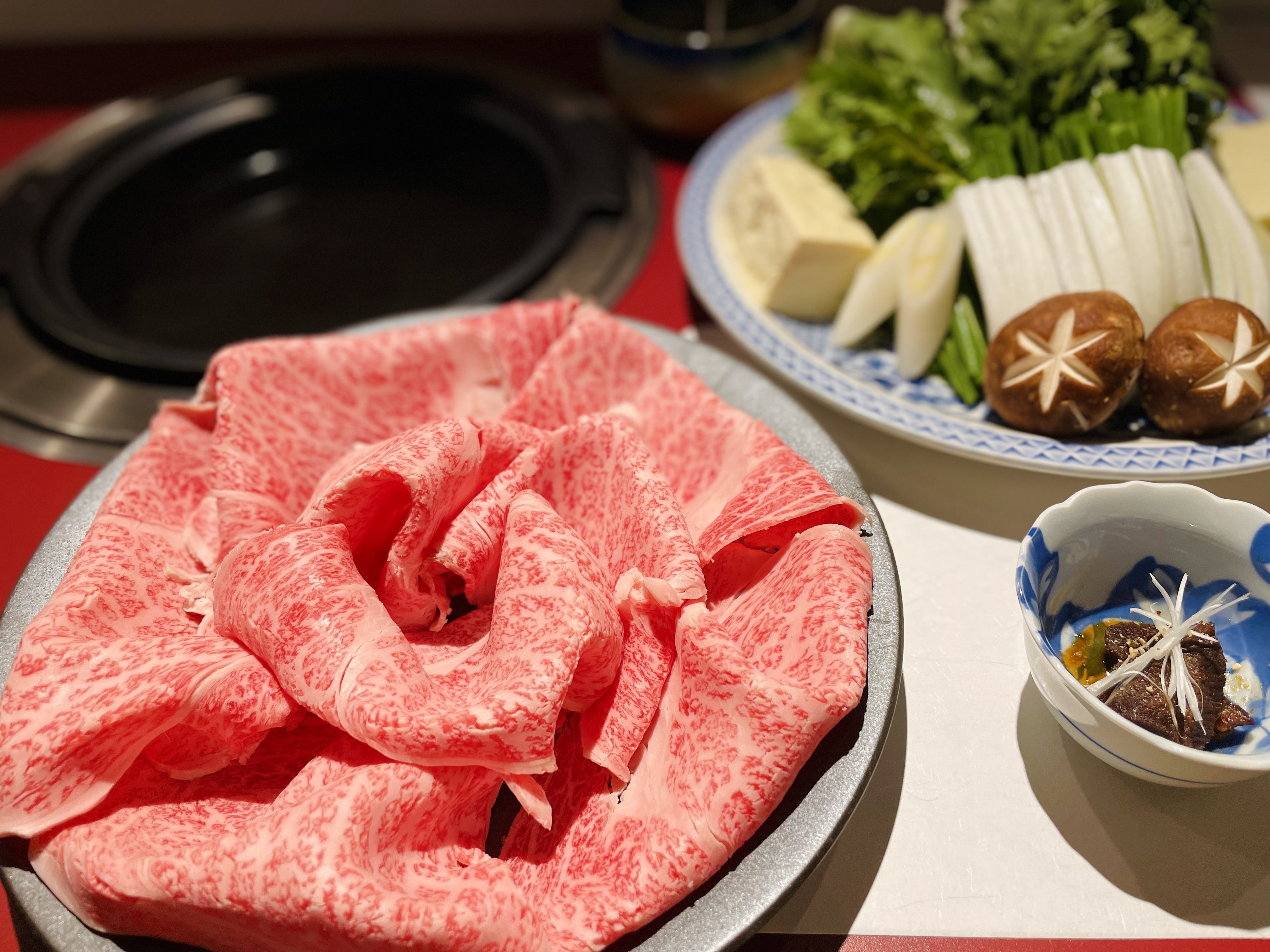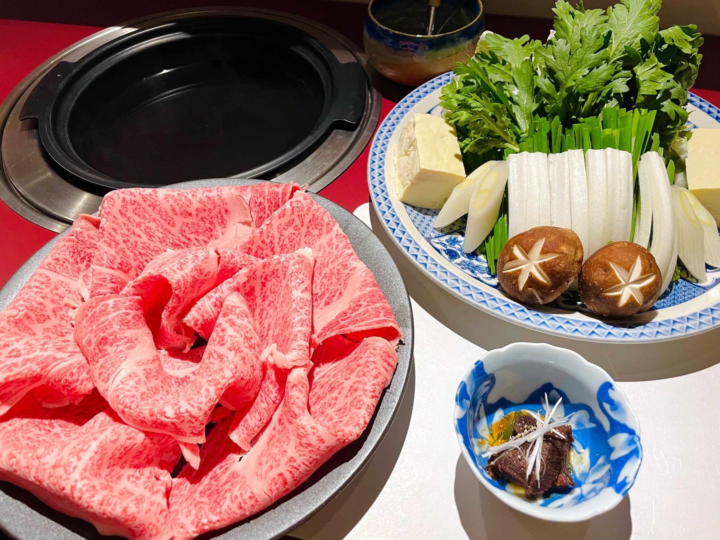 先付・厳選黒毛和牛ロース・中央市場直送鍋野菜・【CAMPFIRE限定】本日のサービス1品・うどん・〆は、赤クッパor白クッパ・季節のデザート