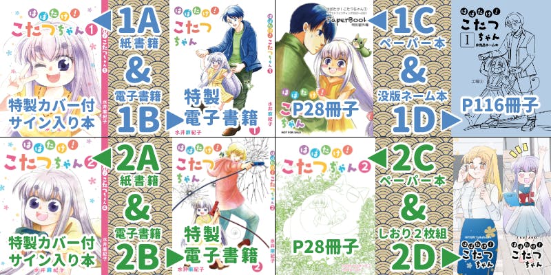 過去リターン品について:1巻関係4種類、2巻関係4種類があります。特に各C品にはここだけの書き下ろし漫画が収録されていますので、漫画を気に入って頂けたご支援者様にはおすすめです。