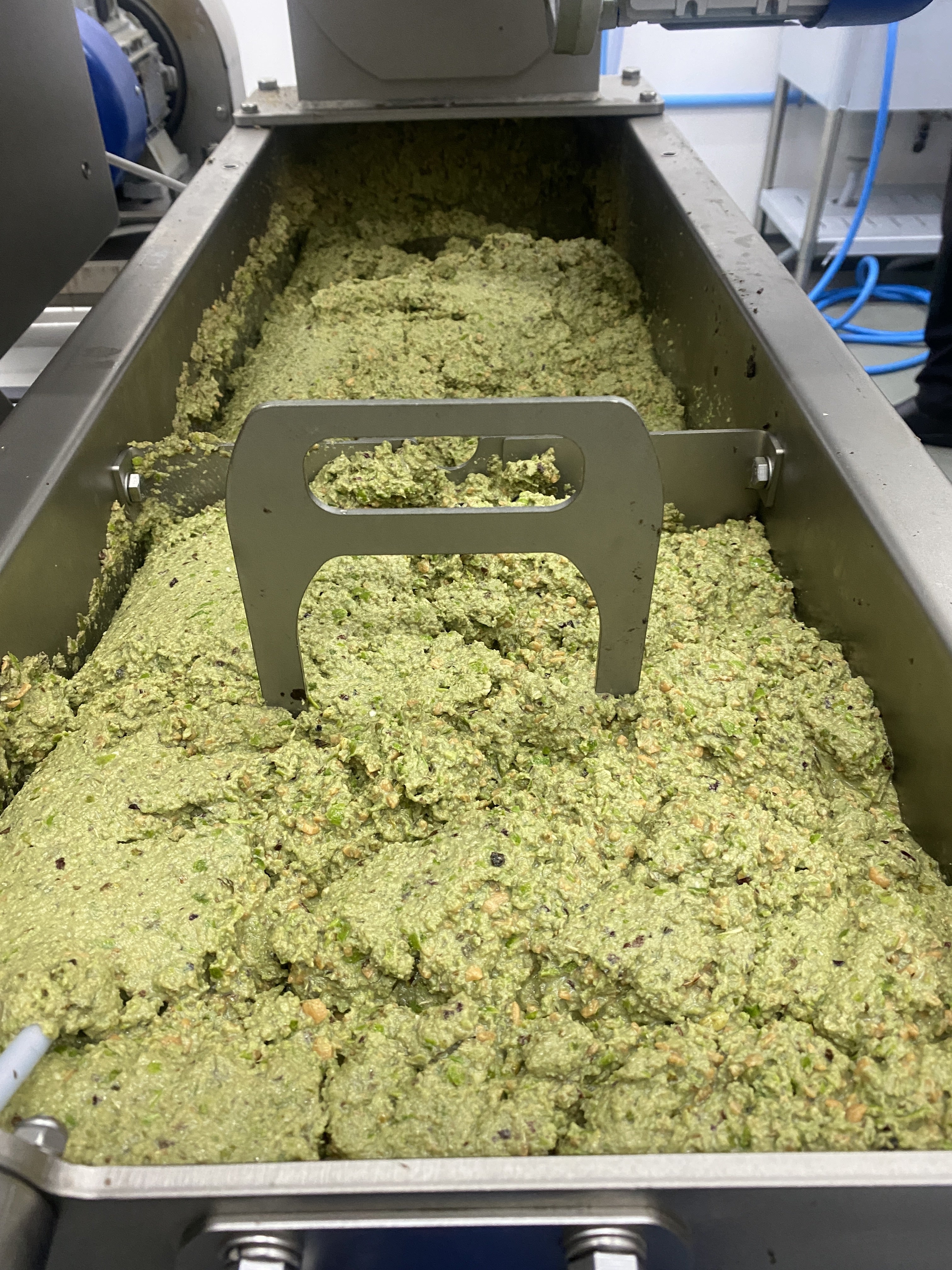 まずはオリーブを洗ってから粉砕機にかけ、種ごと粉々にしてペーストにします。(写真参照)