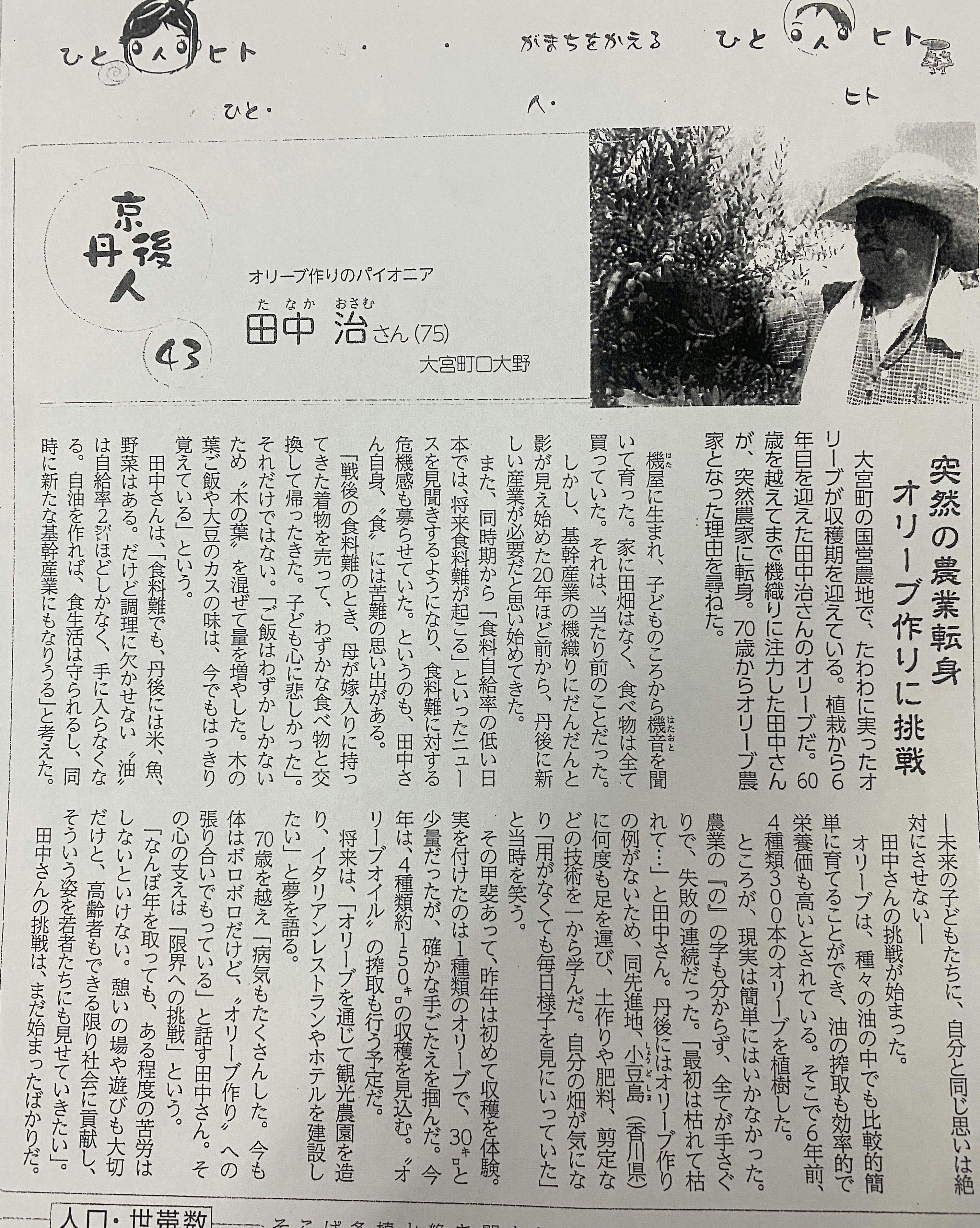 • 本日支援額50万突破しました!!ありがとうございます!!ゴールはまだまだ遠いですが応援していただけることが本当に嬉しいです!励みになります!クラウドファンディングも残り2日になりました。いつも応援してくださる方々本当にありがとうございます。このクラファンをはじめたことによりたくさんの方に声をかけてもらったり、シェアしてもらったりと周りの方たちの温かさを感じて本当に感謝です。ずっと家業に入ってからオリーブをどうしたらもっと活用できるだろうと考えて今回のクラファンに辿り着きました。オリーブを始めた祖父も"オリーブを通じて観光農園を造り、レストランやホテルを建設したい”を目標にしていました。(12年前の京丹後市の広報にて)一歩ずつオリーブ園を成長させていきたいです。引き続き応援宜しくお願いします!! もっと見る