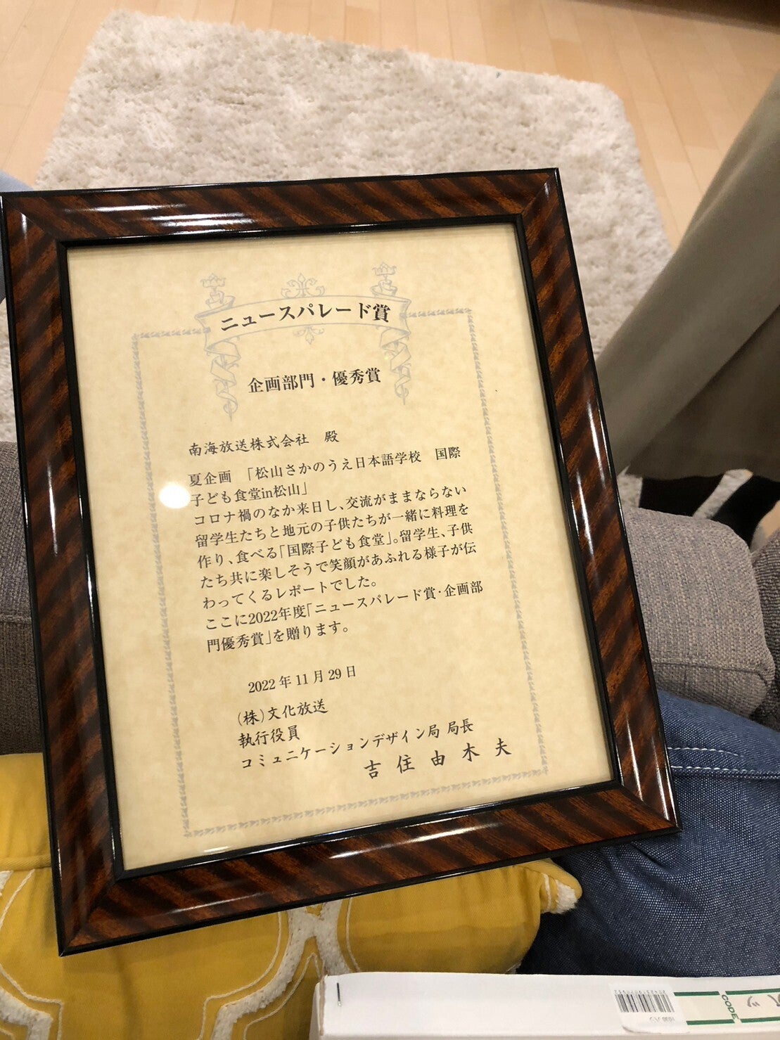 あと、宇都宮アナウンサーが夏の国際子ども食堂の番組が企画部門で表彰されたとのことで、賞状の現物を持ってきてくれました!
