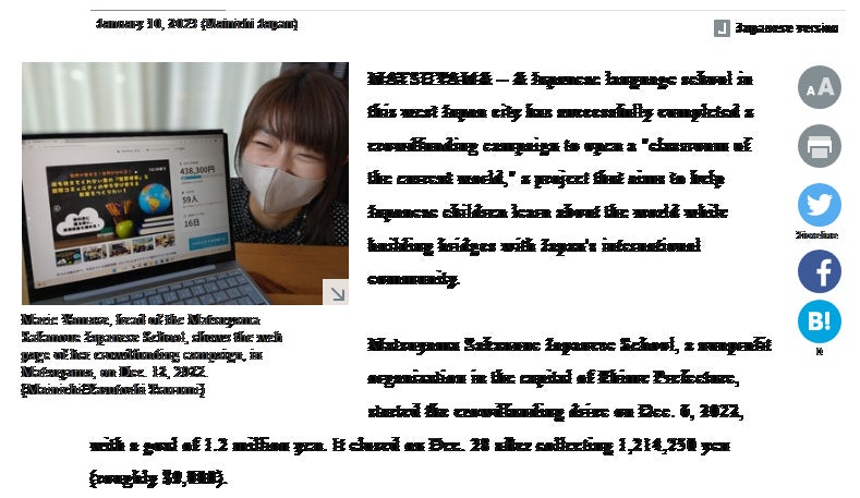 この度のプロジェクト達成について、毎日新聞さんが英語版で記事にしてくださいました!