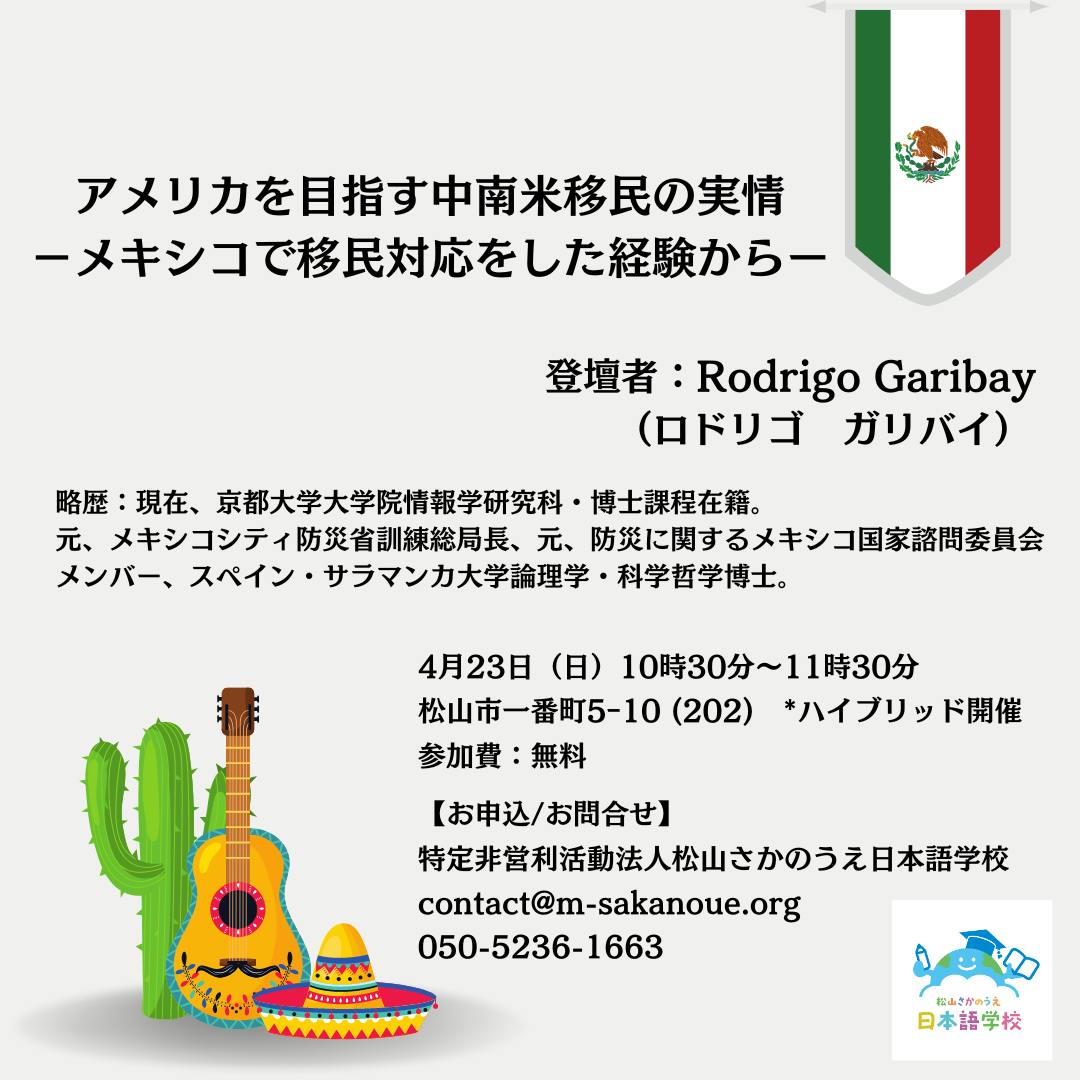 今回はメキシコで数十万人の移民対応のご経験のあるロドリゴ先生を1番町教室にお招きし、当時の様子をお話しいただきます。