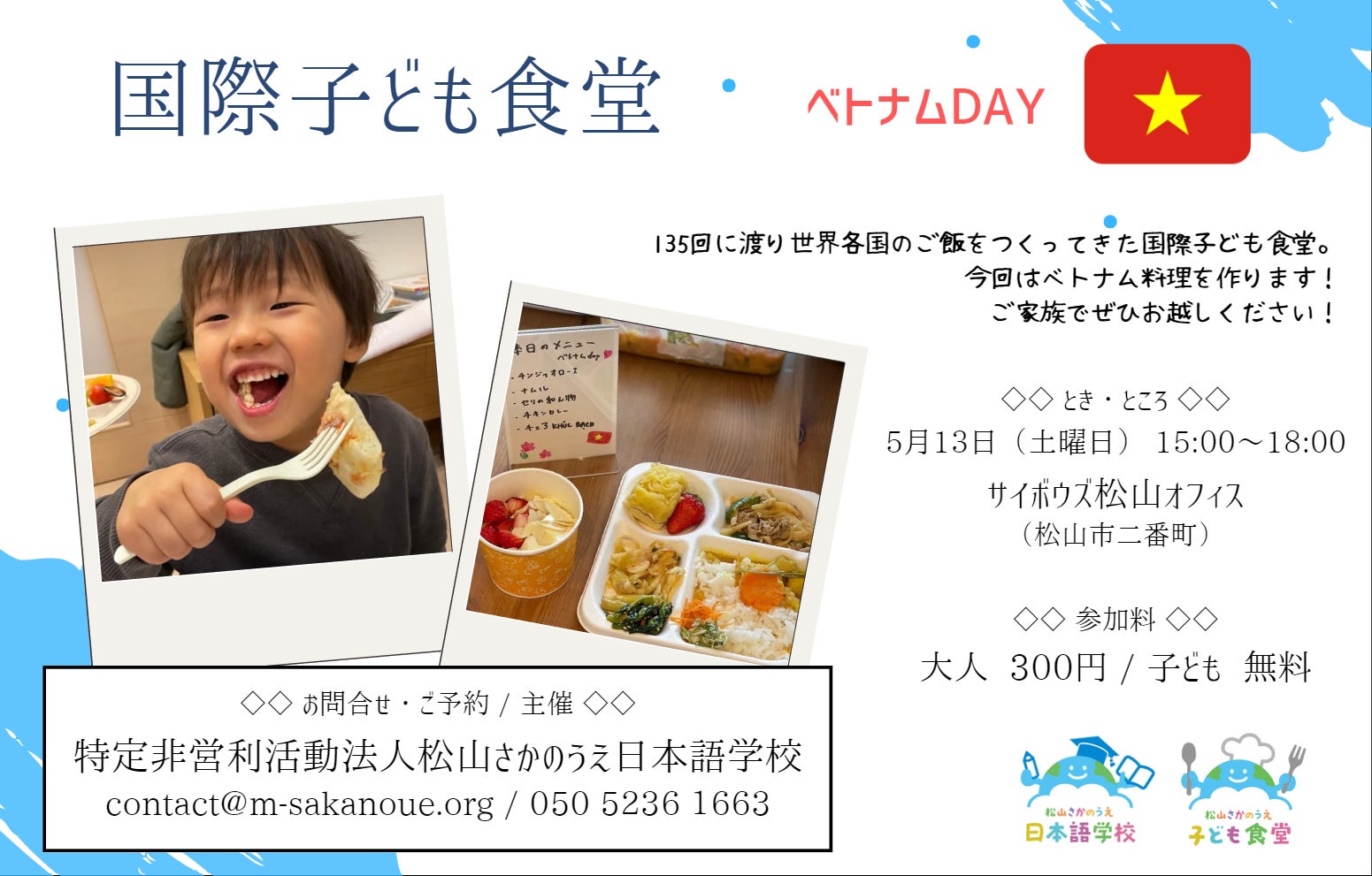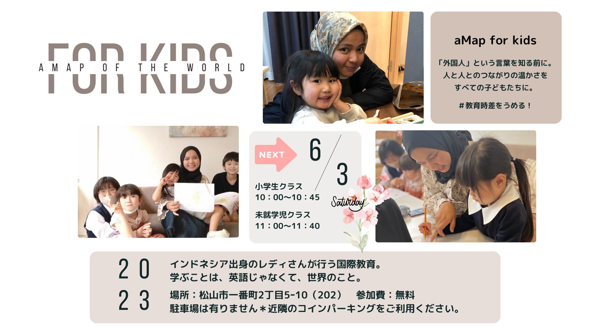 おかげさまで今春より開始した教育時差解消プログラムのなかで、早速クラスを増設しているのが「aMap for kids」です。(なんと6月24日はすでに満席…!)英語じゃなくて、国際教育です!というなかなか伝わりづらい内容ですが、講師のレディさんが子どもたちに「世界」を教えてくれています。初回のテーマは「家族」。生まれ育った国も、言語も、宗教も違うけれど、家族を想う気持ちはみんな一緒だよね。という内容でした。クラスのはじまりに「みんなが1番好きな人は誰?」というレディさんの問いに対して、「ママ!」「おかあさん!」と即答する子どもたちを前に、驚くお母さんたちの表情がとても印象的でした。そんなレディさんはラマダン中で(日の出から日没まで飲まず食わず)で、お母さんたちにイスラム教についても教えてくれました。ラマダンについて、「え、妊娠中も飲まず食わずなの?!小さい子ども?!」というお母さん目線の質問もとても印象的でした。テーマはいつもレディさんが考えてきてくれています。(ちなみに前回は自然でした)次回も楽しみです。またこちらで報告できたらと思っています。さて、続いては6月度の国際子ども食堂のお知らせです。大分県から避難民の方々をお招きし、ウクライナ料理を一緒に作って一緒に食べる企画を予定しています。本当はセミナーもいいなぁ、と思いながら一緒にごはんつくりながら、一緒にごはん食べながら、リアルな声を聞く機会もより貴重だと思い、国際子ども食堂にゲストでお越し頂くことにしました。とてもとても楽しみです。また、5月度の国際子ども食堂の様子は(つなぐ・つながる就労企画の内容も強いですが)、南海放送さんが素敵にまとめて下さいました。ぜひご覧ください!【国際子ども食堂】外国人との懸け橋に…広がる外国人への支援の輪<NEWS CH.4> - YouTubeあと、ホームページをリニューアルしました!手作り感あふれる状態ですが、少しずつ修正して参りますので温かく見守っていただけると嬉しいです。【公式サイト】松山さかのうえ日本語学校さて、長くなりましたが、引き続きこちらで活動報告を行いますので、みなさまどうぞお付き合いくださいませ。そして、お近くにいらした際はそして1番町教室にもぜひ遊びにいらしてください。
