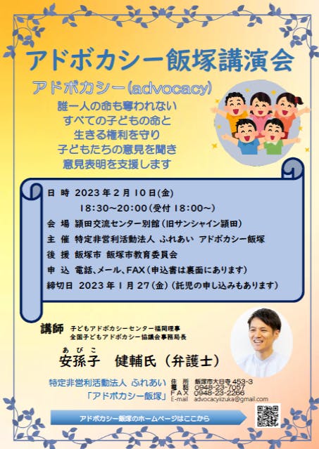 第1回目の講演会のチラシを作成しました。まずはこの飯塚市でアドボカシーという言葉を知ってもらい、活動への理解を広め子どもたちに幸せに生きてほしいと願う大人が増える事と同時に、大人自身が自分の生き方がどうであったか振り返るきっかけになればと思います。