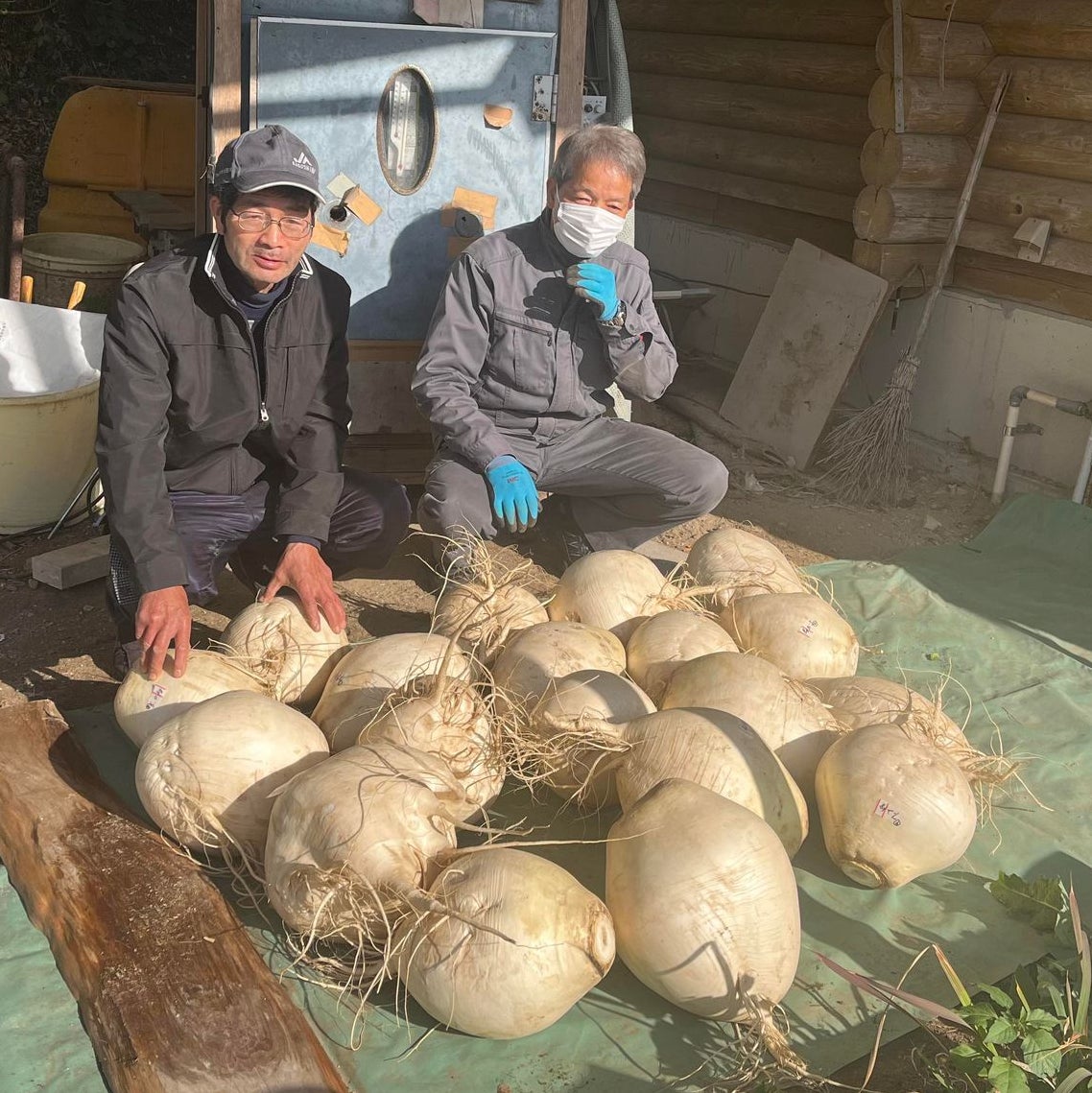 福田さんが届けてくれた、今年初収穫の桜島大根。このまま2〜3日干してから切り干し作業のスタートです。