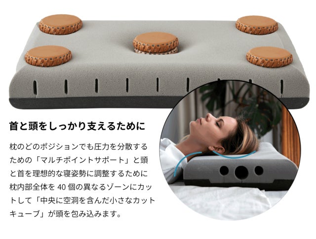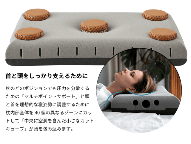 注目されている頭部周辺の環境を快適にすることに着目して設計されたデザインで気持ちの良い睡眠環境を整えるために作られた独自設計です。