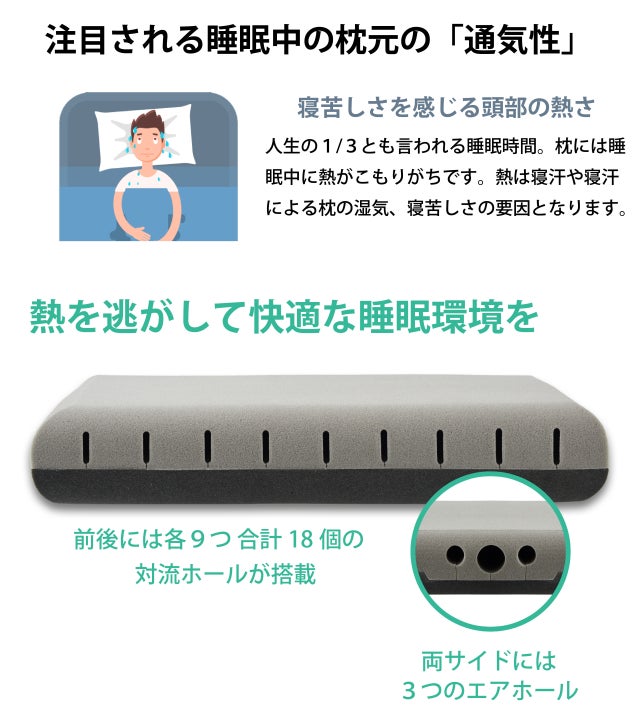 こもりやすい枕の熱をすべての角度から通気させることで「枕の温度管理」ができる新しい枕デザインを採用しています。