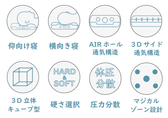 それぞれのキューブが立体的に頭を支えるため、寝返りなどで動く頭の動きに枕が形を変えて合わせてくれます。