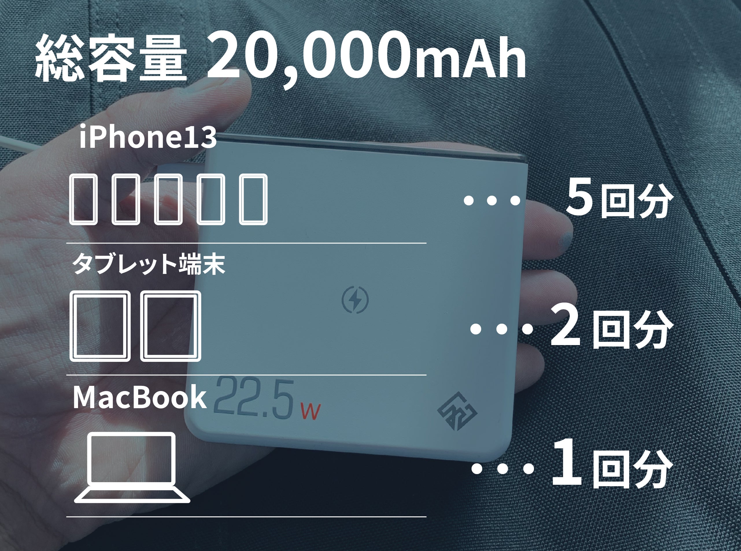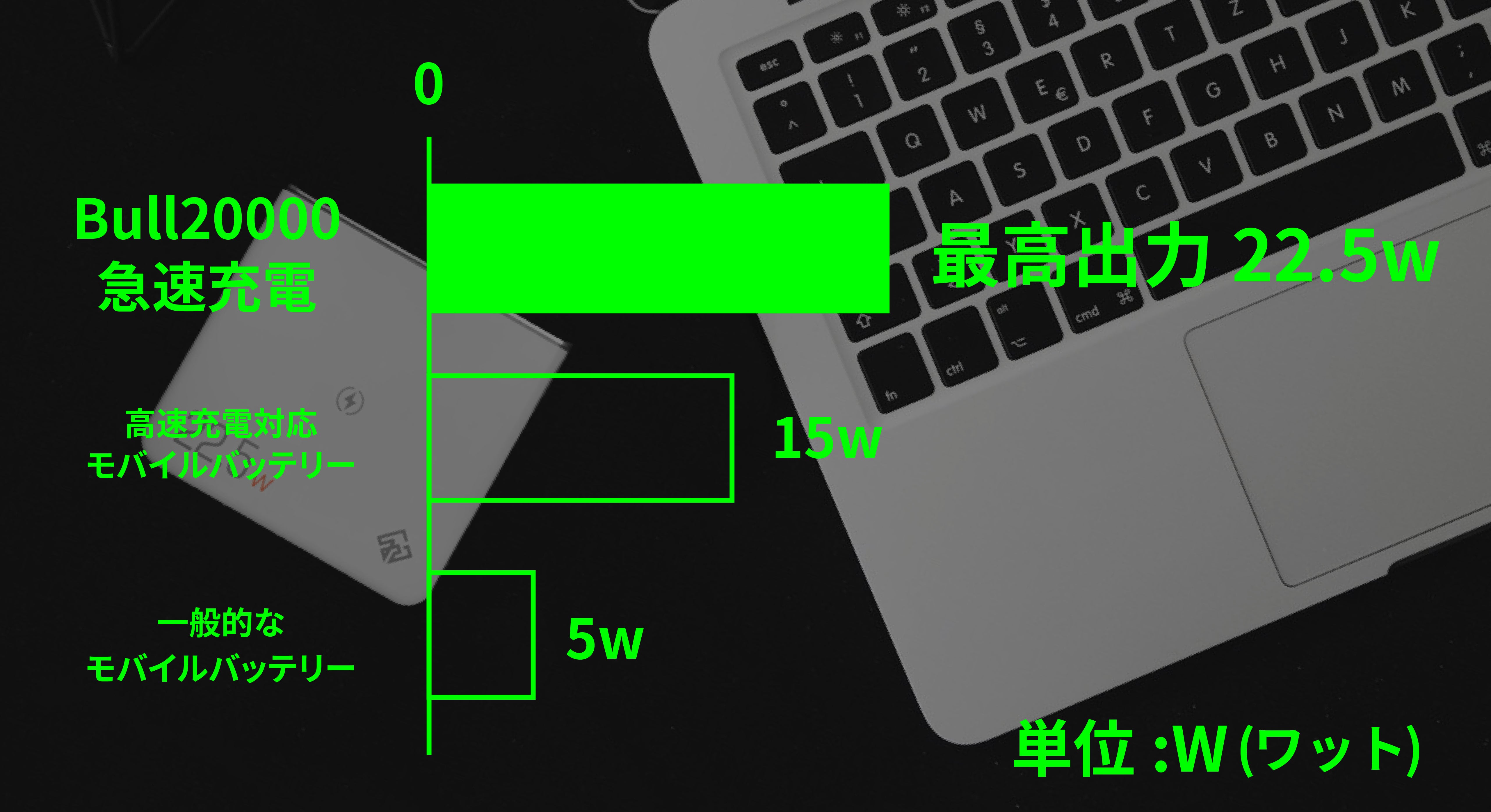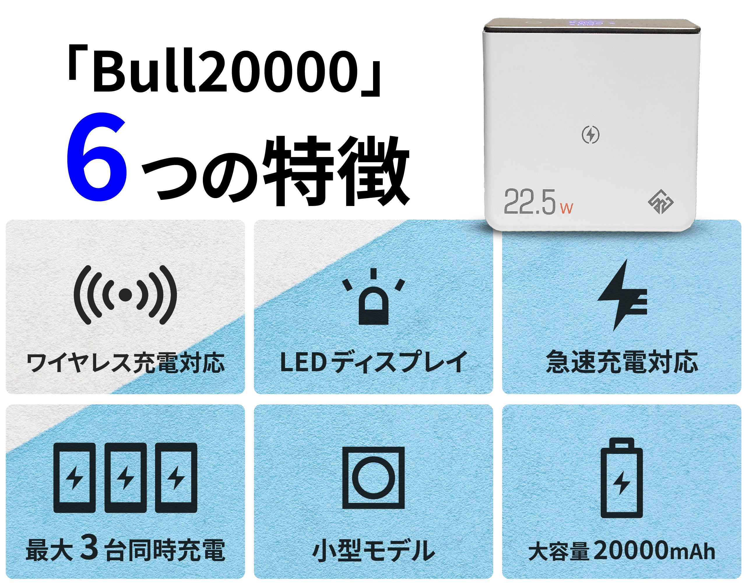 「Bull 20000」は最大出力22.5Wの高出力を実現し、18W以上の出力が必要なMacbook Pro等の充電にもご使用いただけます。