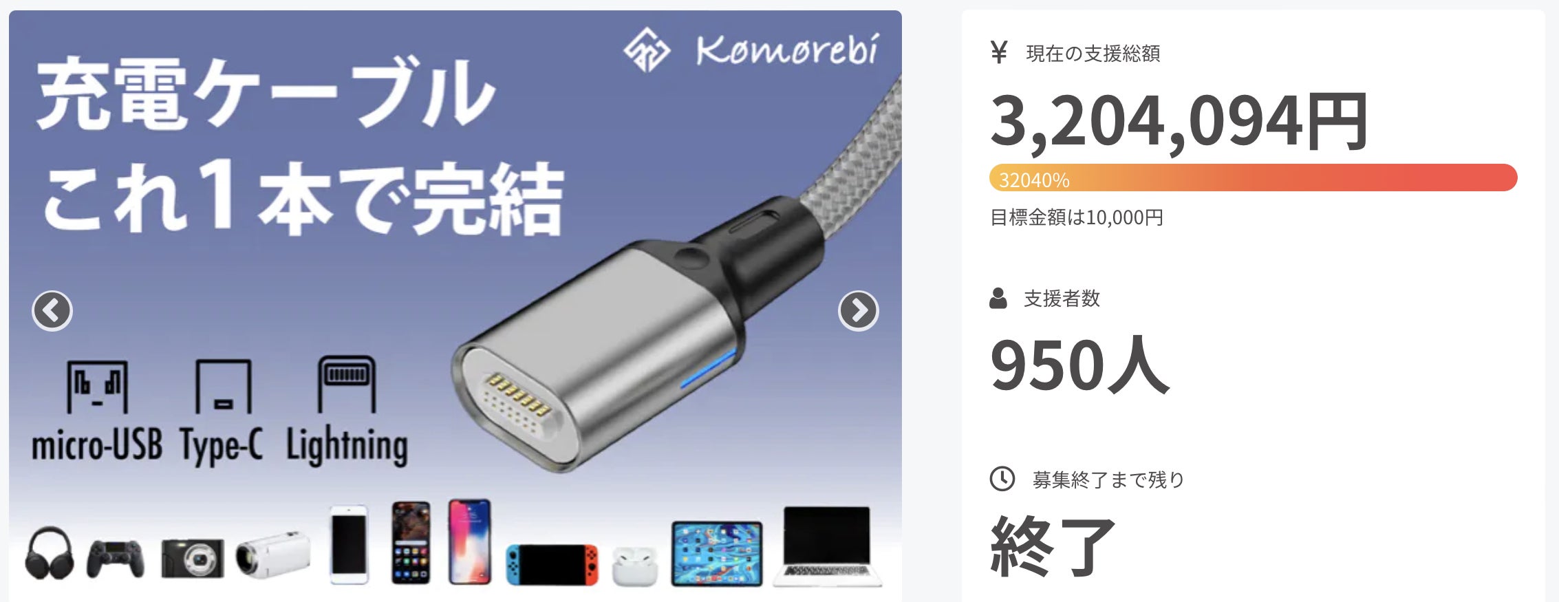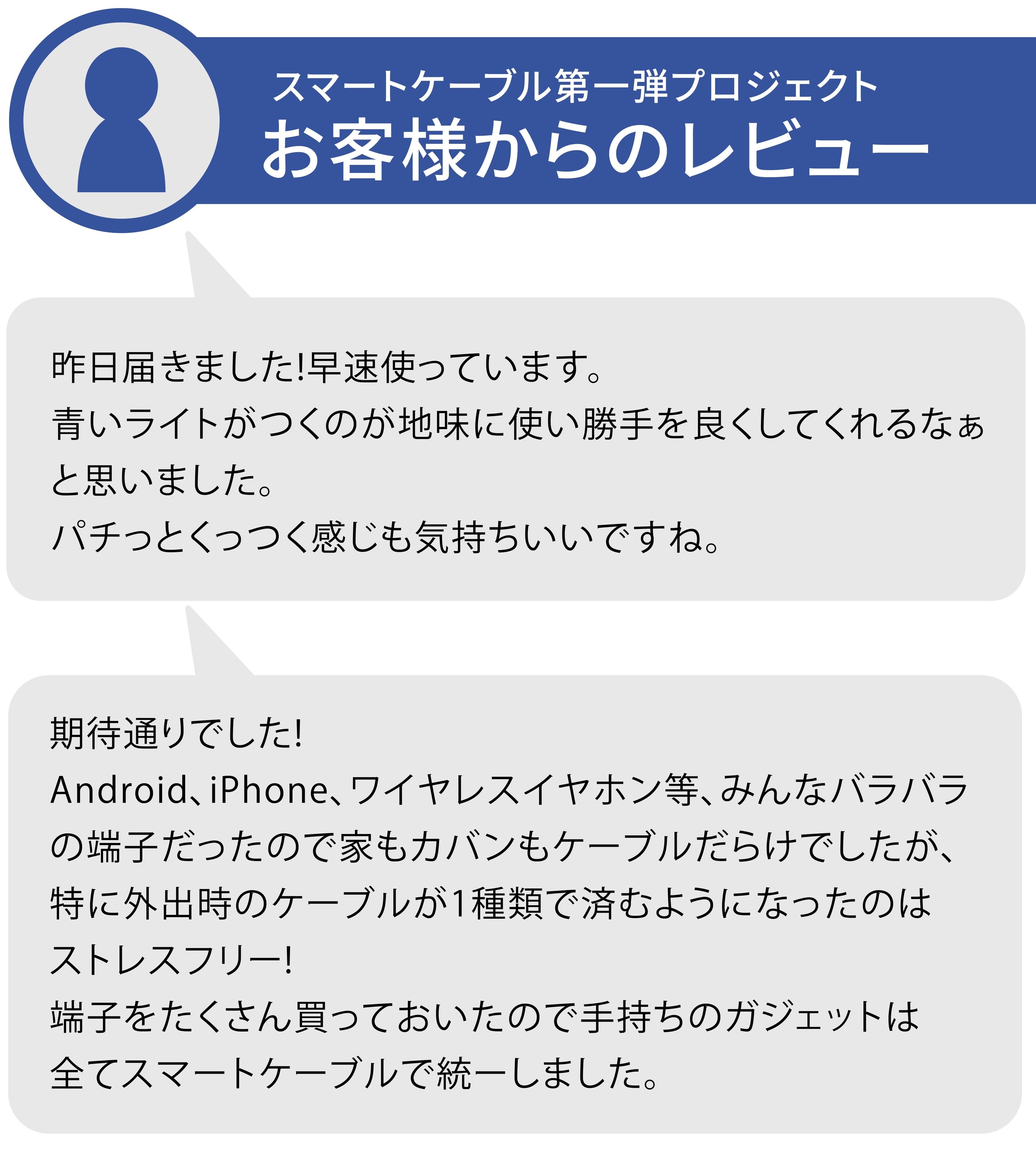 ケーブルは、異例の累計2万本完売を記録した、どんな端末にも一本で充電が完結するスマートケーブルです。