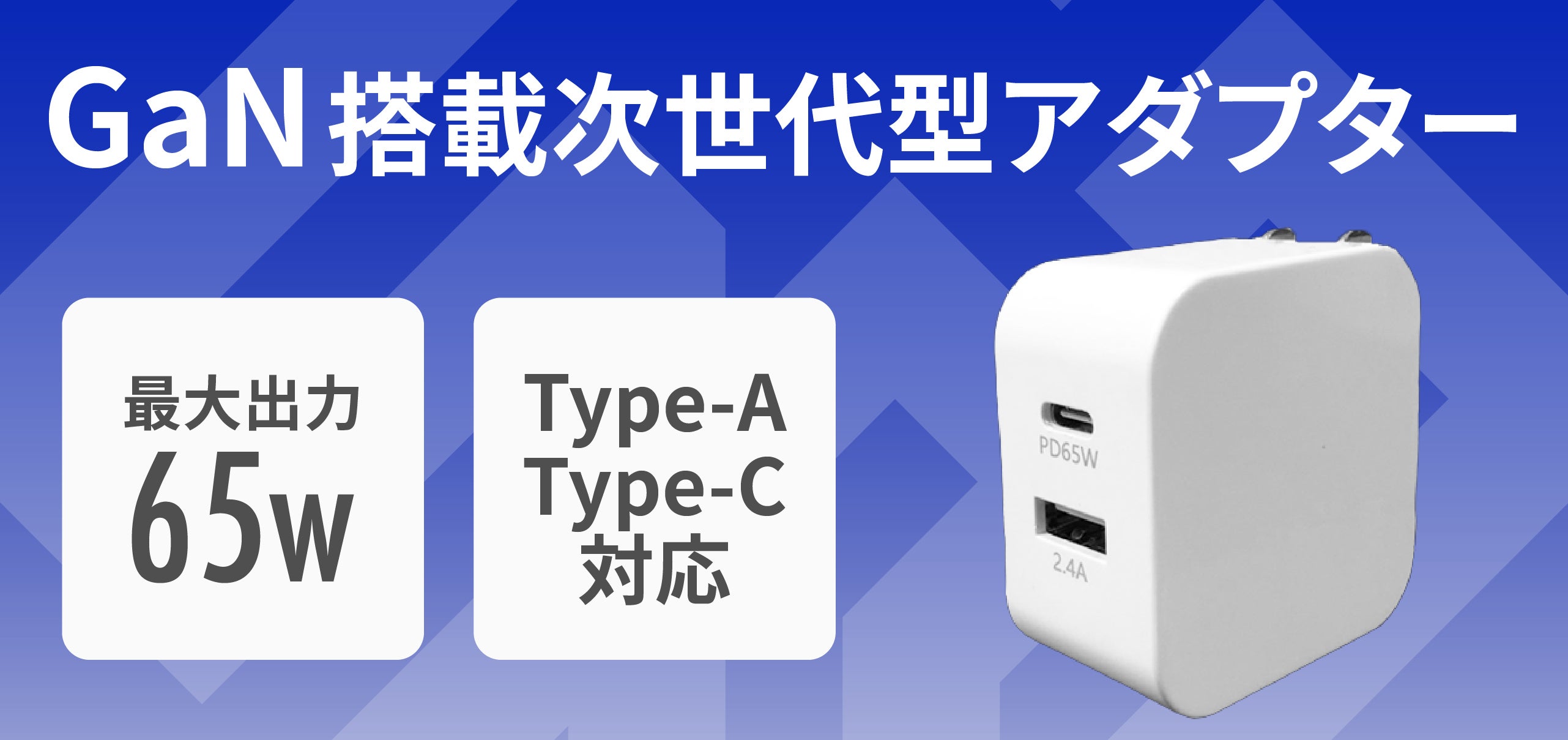 GaNアダプターは、手のひらサイズでMax65Wの出力に加え、混合2ポートの2台同時充電に対応したハイエンドモデルです。