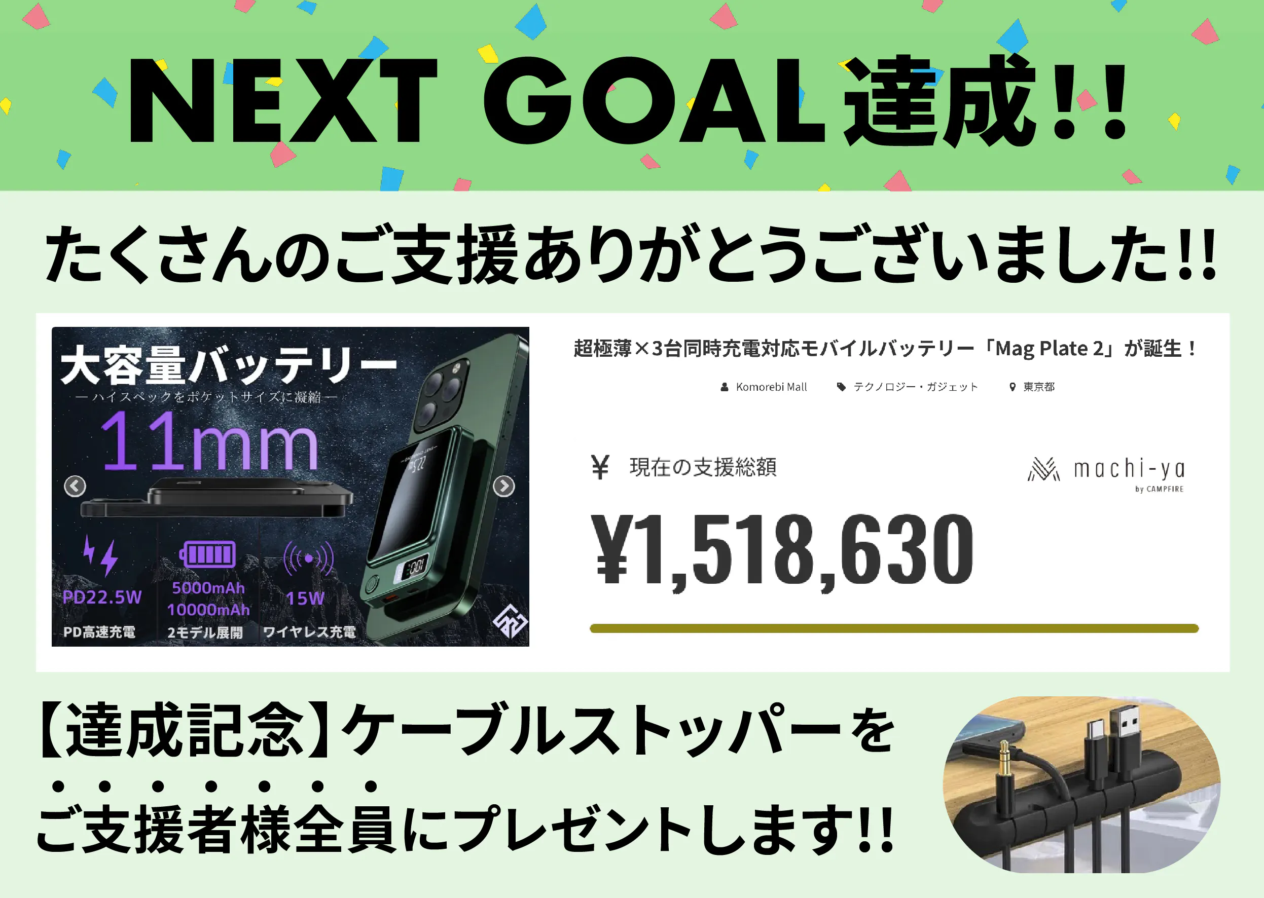先日、【超極薄×3台同時充電対応モバイルバッテリー「Mag Plate 2」が誕生!】プロジェクトが、ネクストゴールであった総支援額150万円を達成しました!