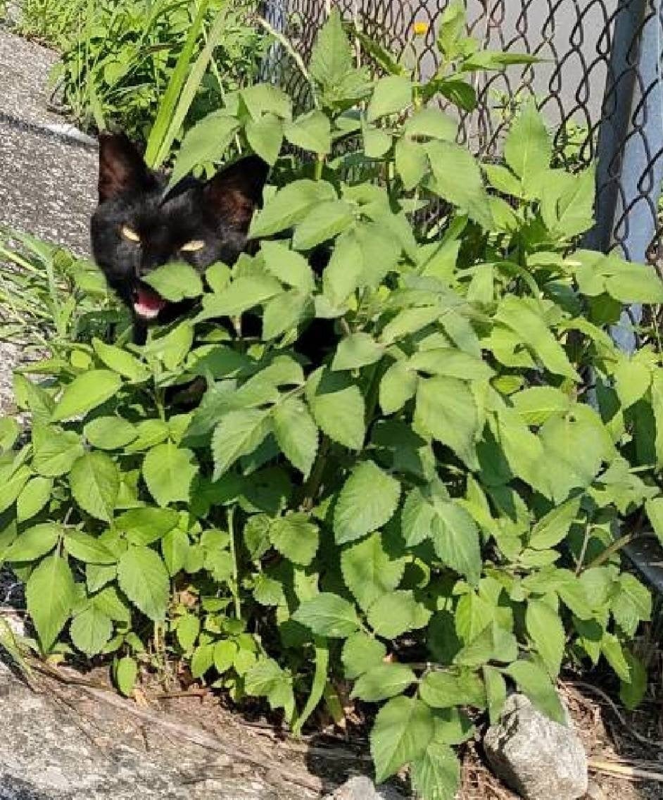真夏はアスファルトの草影で「はぁはぁ」と口を開けて苦しそうにし