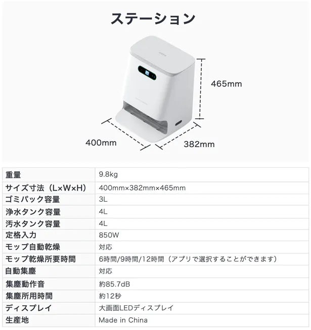 Q2:一回のフル充電で、どれくらい掃除することができますか?A2:約180平方メートル(=約116畳)のエリアをお掃除することができ、お掃除が完了すると、自動でステーションに戻り充電するため、常にフル充電の状態を保つことができます。
