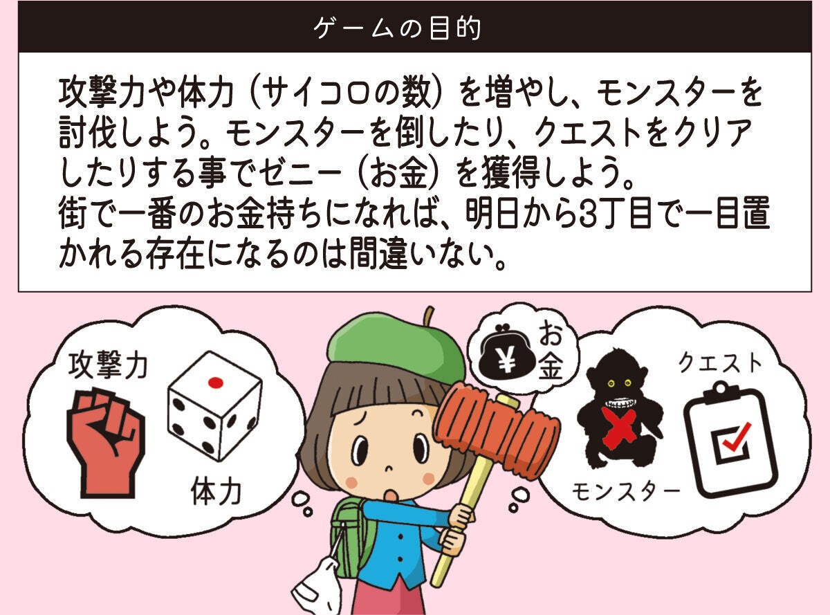 このゲームは、攻撃力や体力(サイコロの数)を増やしながら、モンスターを仲間にしていく、まるでドラクエのようなRPG風ゲームです。