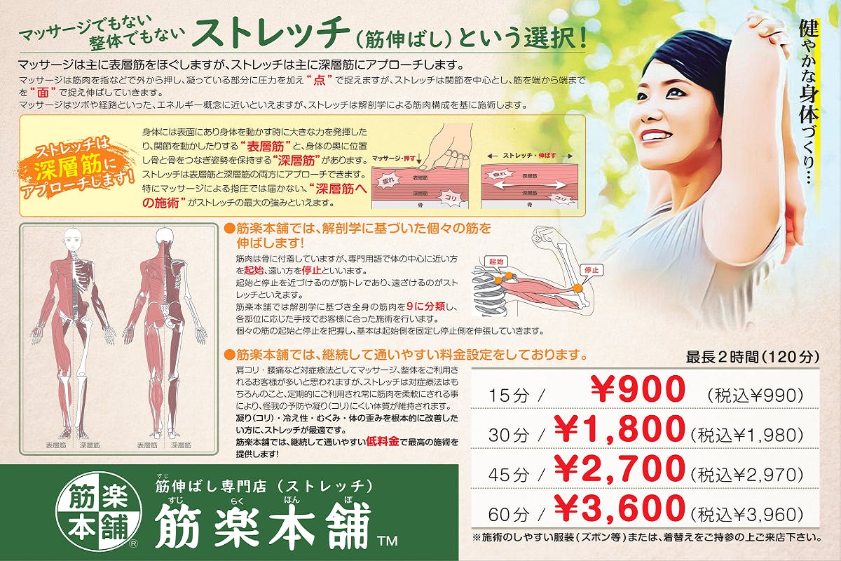 また、既存のストレッチ専門店では料金も高く定期的に通うには経済的負担が大きいと感じ、自社で低料金で継続して通いやすい店「筋楽本舗」を開業いたしました。