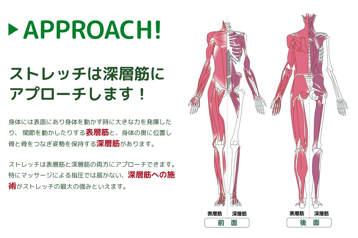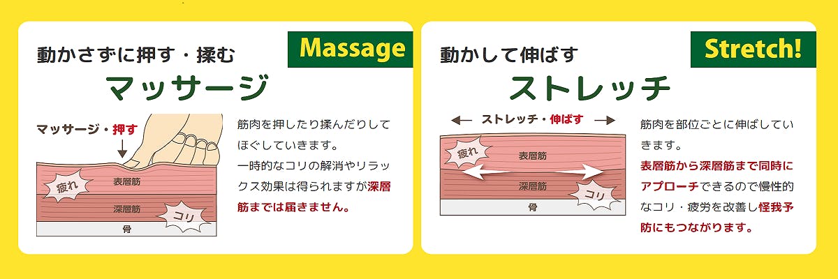 マッサージは主に表層筋をほぐしますが、ストレッチは主に深層筋にアプローチします。