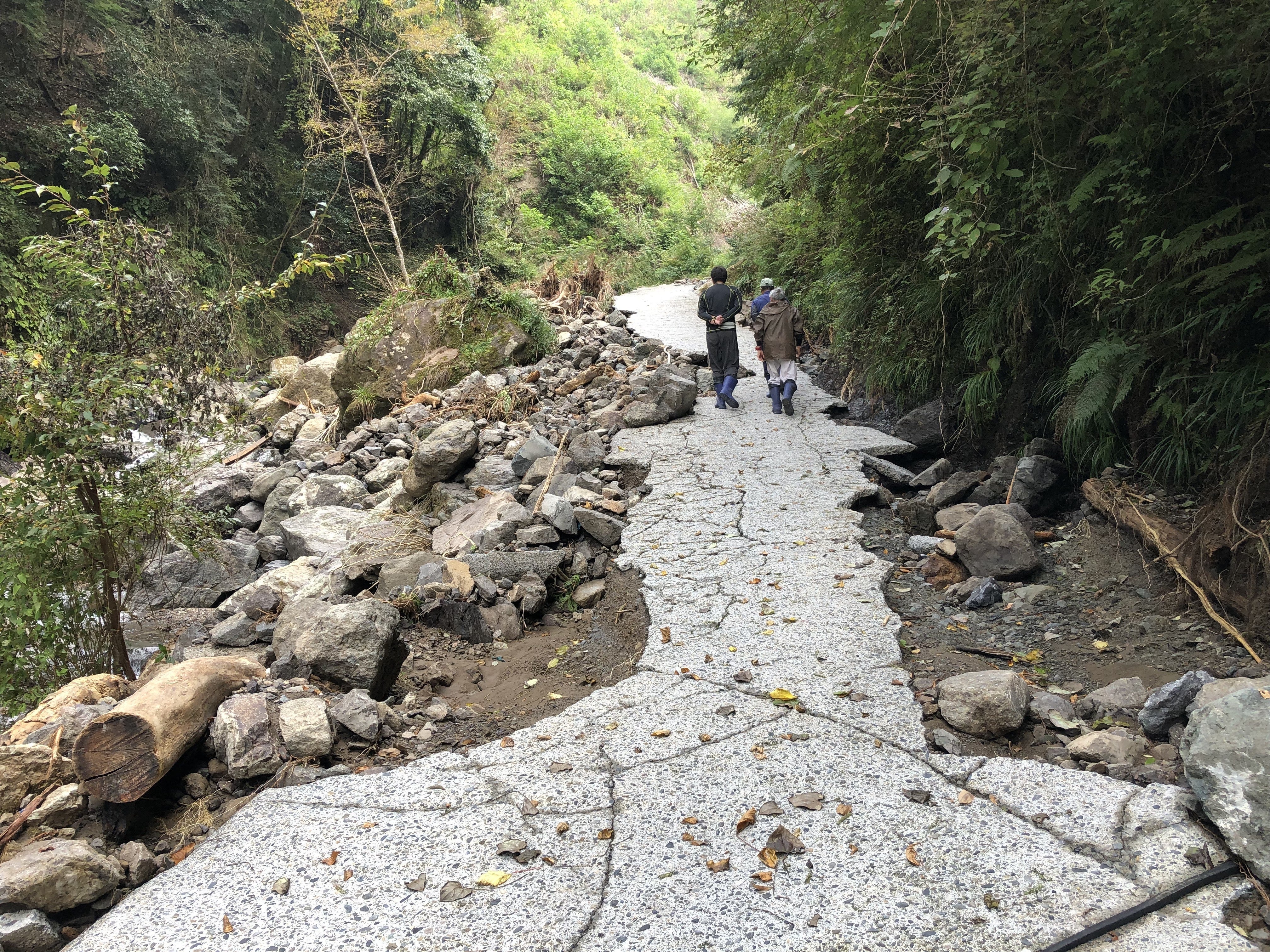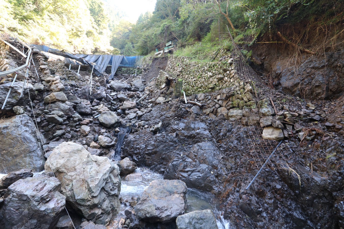 わさび田のある安倍川に通ずる沢も、普段はほぼ干上がっていた状態だったのですが、10m以上の高さがある堤防を越えて水や土砂が入ってきてしまい、農林道も大きな被害を受けました。