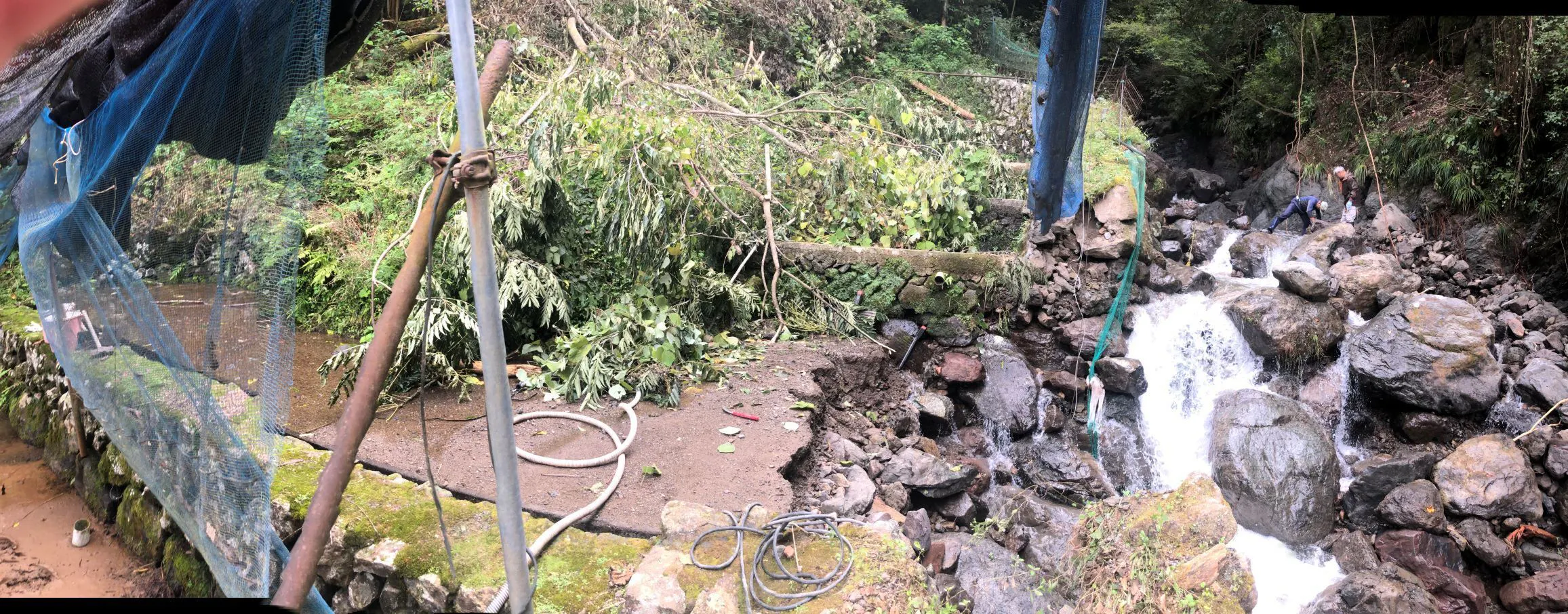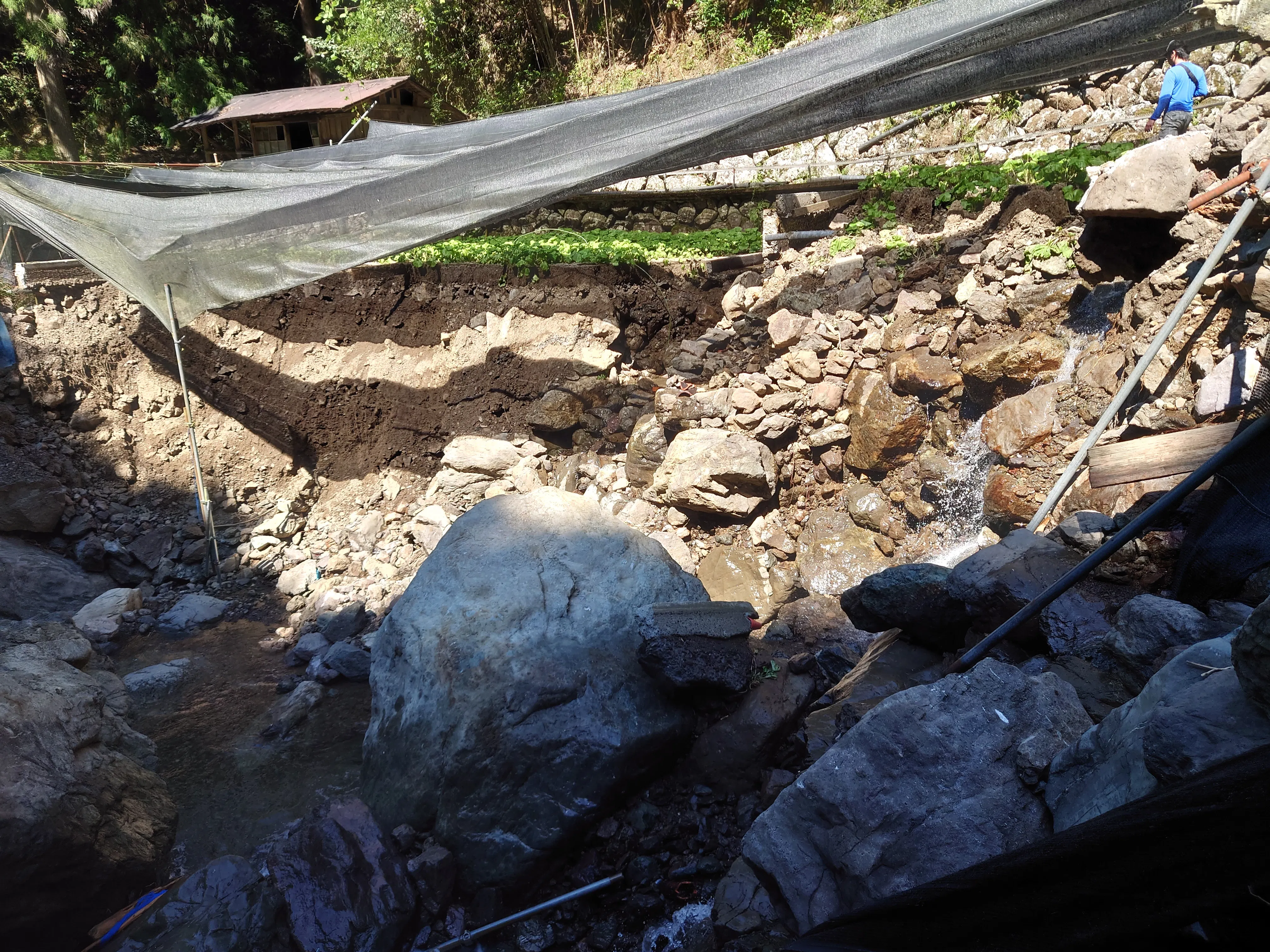 現在は無事だったわさび田の収穫・栽培をしながら、同時並行して被災箇所を自助的に修復している状況です。