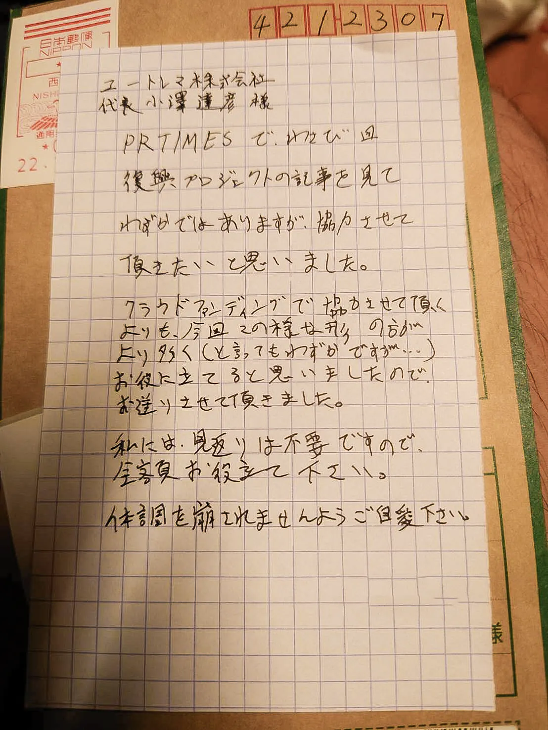PRTIMESでの被災復興のプレスリリース配信にて情報をお知りになり、お手紙をお送りいただきました。