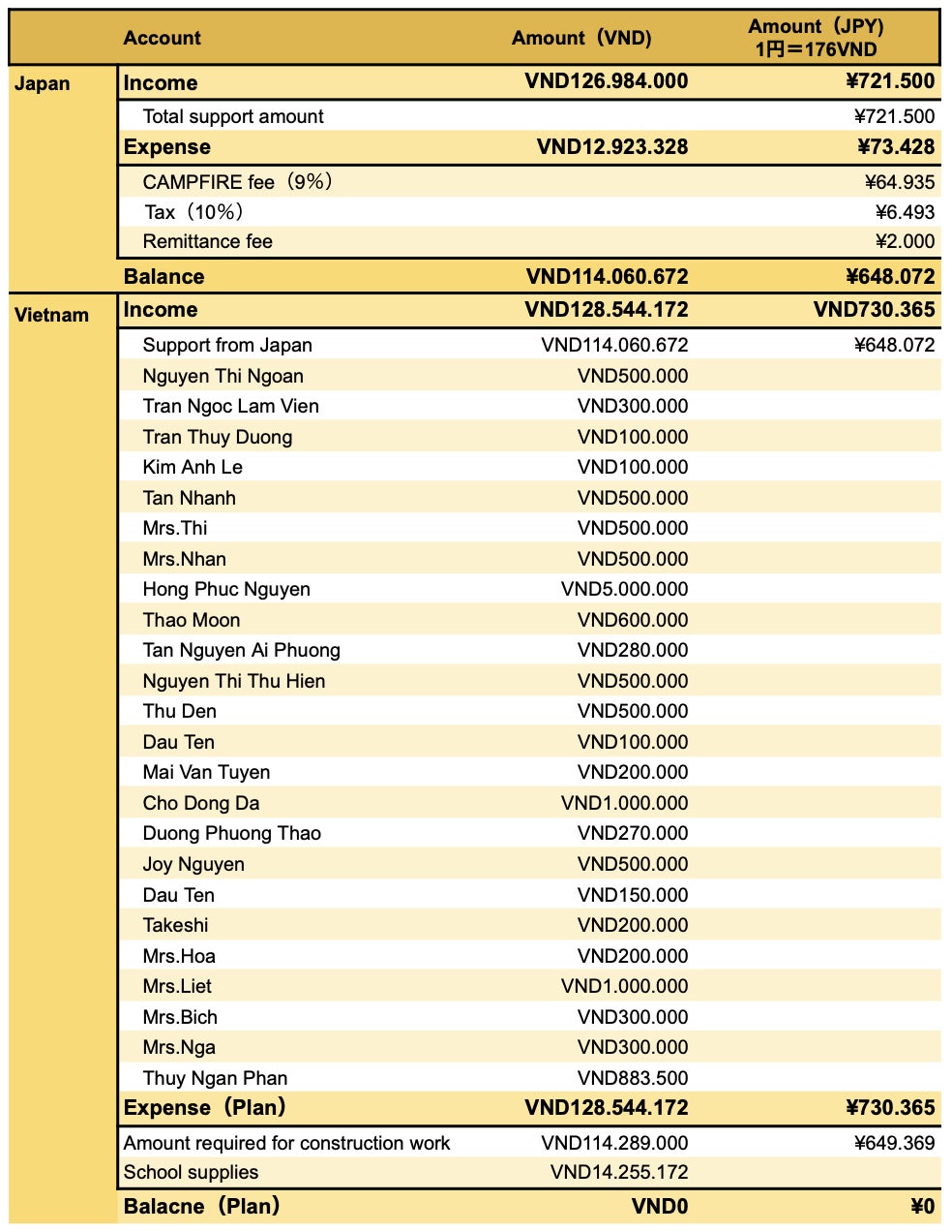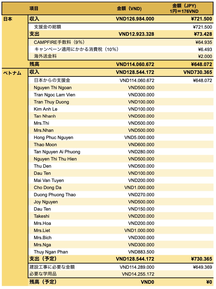 現在、目標金額の101%、721,500 JPYに到達しています。さらにベトナムから直接支援して頂いた方もいらっしゃり、ベトナム側では14,480,000 VND(約82,000円)のご支援を頂きました。