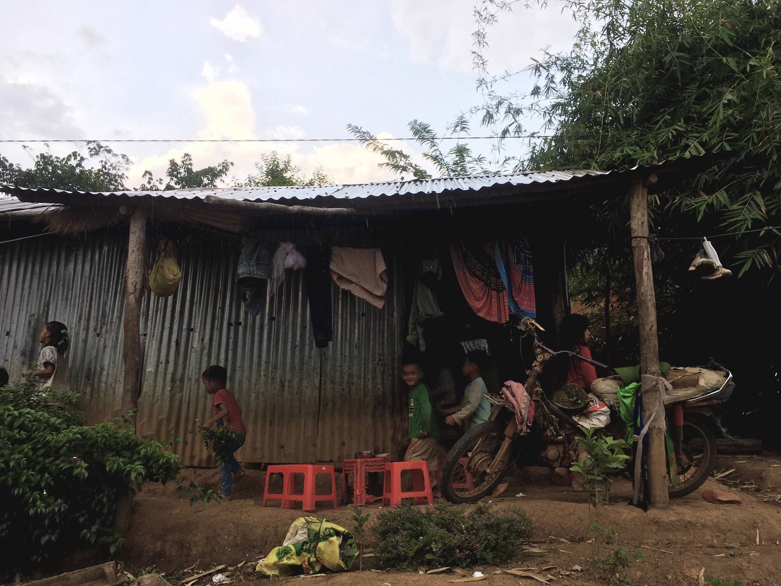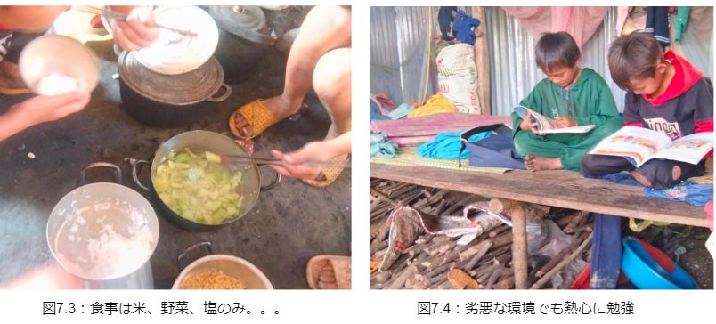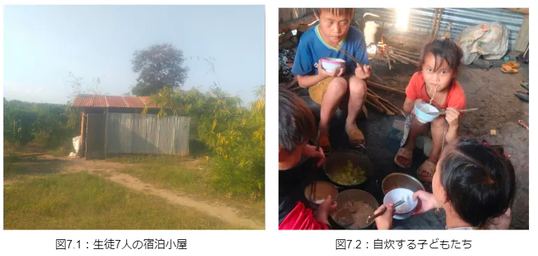 曜日から金曜日まで学校に泊まる子どもが約7人います。子どもたちの家は学校から遠く離れるため、親たちは子どもが泊まるために小さな宿を一緒に建てました。毎日、子どもたちが小川から水を汲んで自炊し、食事は米、野菜、塩のみです。熱心に勉学に励む子どもたちの話を聞いたり、写真を見たりして、心が痛みました。電気も、水も、充実した食事もありませんが、彼らの学ぶ意欲は強く燃えています。