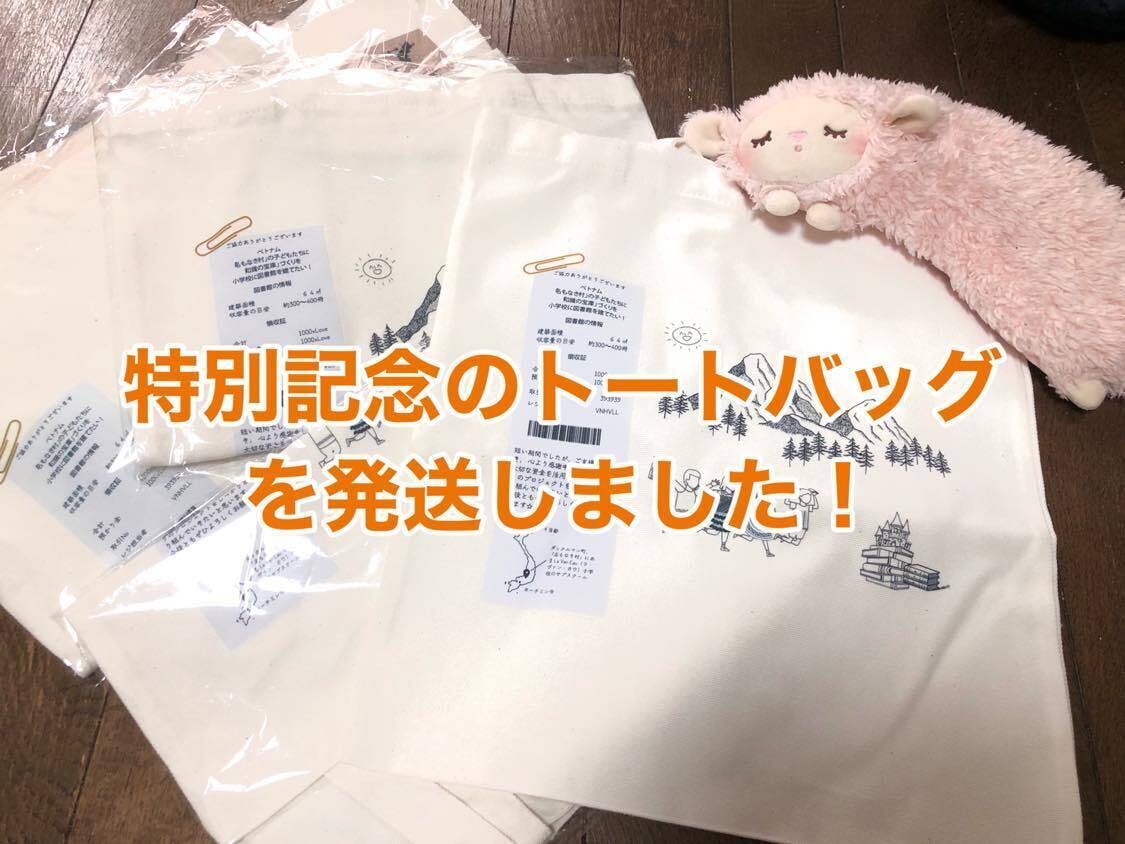 本日はお届けのお約束をしておりました特別記念のトートバッグのリターン品を発送致しました。皆様のお手元にもうすぐ届きますので楽しみにお待ち下さい!!