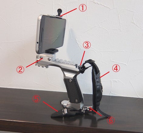 スマートフォン搭載のカスタム例です このカスタム仕様ではスマートフォンで映画の緊張的なシーンを動画撮影できます。 「うごくな!手をあげろ!」と、家族を困らせるこまったおじさんの役に挑戦して みるのも良いかもしれませんね。 ①②だけでスマートフォンは搭載出来ますが他のパーツを組み合わせると よりいっそう楽しめるかと思います。 ①スマートフォンホルダー 百均等で購入できる三脚、自撮り棒等を流用 ②1/4カメラネジマウント NITRO.Vo カメラマウントベース https://www.amazon.co.jp/gp/product/B00JCPB3G4/ref=oh_aui_detailpage_o00_s00?ie=UTF8&psc=1 1/4カメラマウントの中で上記の物が最も使いやすい物です。 スマートフォンとセットの物や類似品もありますが、スマートフォンホルダーやカメラを固定する1/4ネジが任意の位置で固定出来ないため不向きです。 「5Ax」ではお手頃な価格で提供出来るよう1/4カメラマウントも製作中です。 ご必要な方は只今、リターンにあるセット品をお勧めします。 ③1/4ストラップアダプター http://www.amazon.co.jp/dp/B007VVW48C/ref=cm_sw_r_tw_dp_U_x_SUKTAbPVHS16H http://www.amazon.co.jp/dp/B00W526LM2/ref=cm_sw_r_tw_dp_U_x_oYKTAb40JRD04 ④グリップストラップ https://www.amazon.co.jp/gp/product/B00CQUODRI/ref=oh_aui_detailpage_o09_s00?ie=UTF8&psc=1 一部不要な部品を取り外します ⑤ニミ三脚 Lサイズ https://www.amazon.co.jp/gp/product/B00GTLFHT8/ref=oh_aui_detailpage_o08_s00?ie=UTF8&psc=1 カメラグリップを自立させる際、角度を決めやすく便利です。 また、使用時脚を小指側へ持ち上げるとフィットして良いです。 ⑥ナスカン 手芸店や百均で購入できるストラップ等から流用できます。
