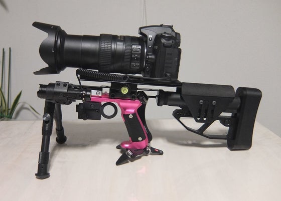 カメラグリップと開発中の引き金式シャッター以外は全て市販品です。 こんなスタイルも実現! 実際に撮影してみるとストックの効果で非常に安定しています。