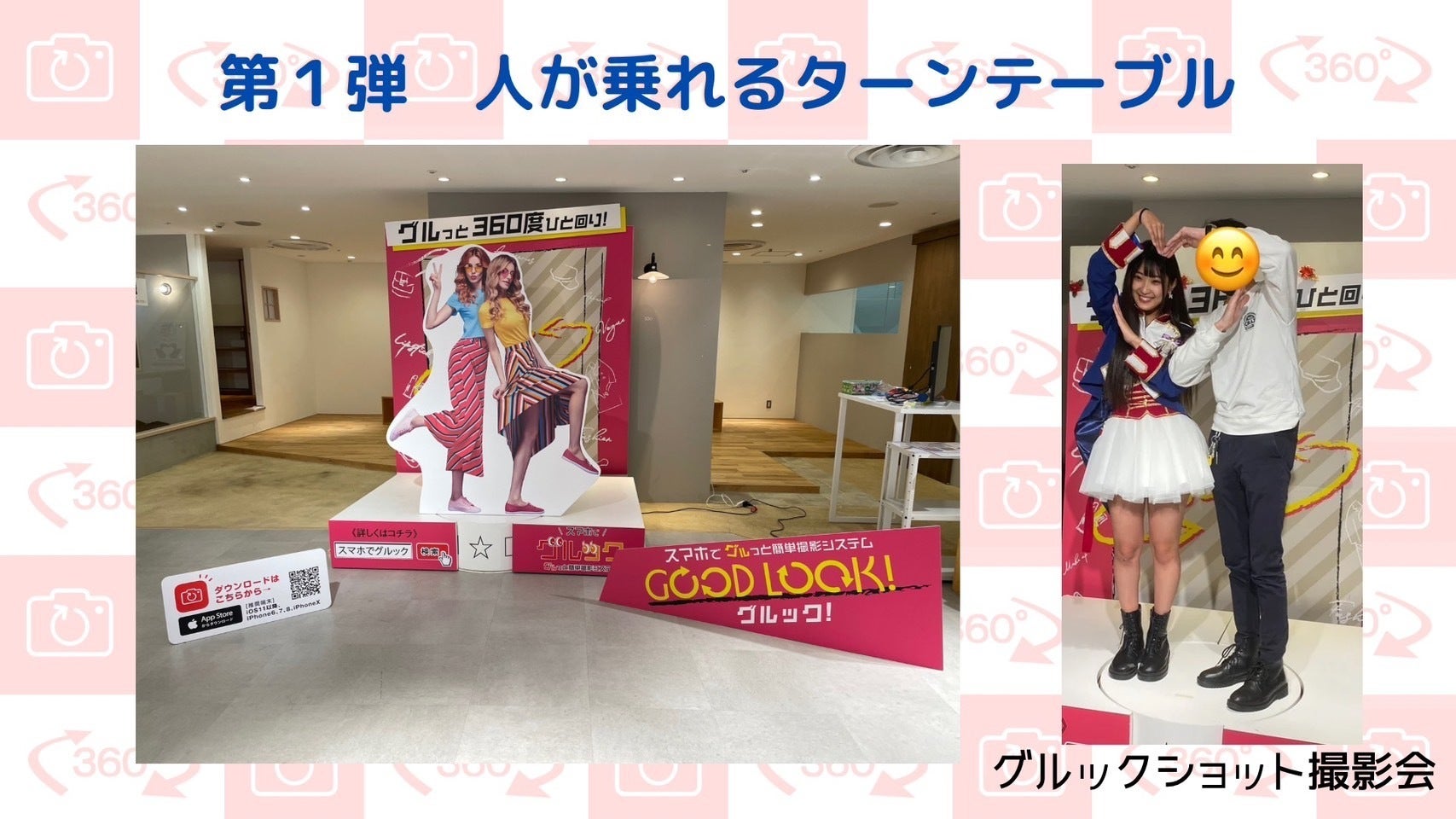 改良を重ね2019年11月に第1弾として、人が乗れる大きなターンテーブルを作成し、集客イベントやアイドルとファンが一緒にグルっと360度回って撮影するサービスをスタートさせていただいており、おかげさまで360度撮影体験をされたお客様より大変好評をいただいております。
