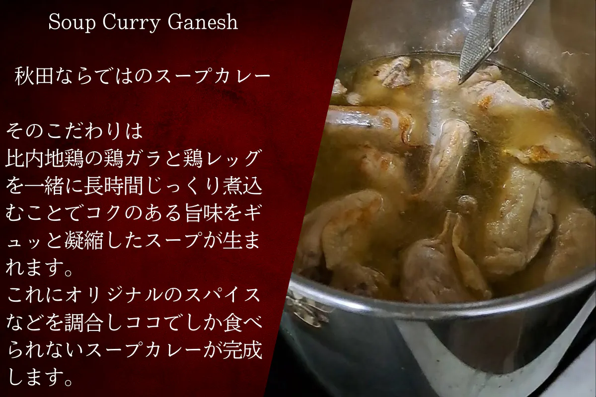 Ganeshの作るスープカレーは秋田の食材の旨味がギュッと凝縮されたスープカレーです。近い将来秋田を代表する逸品に成長させていけるように精進してまいります。