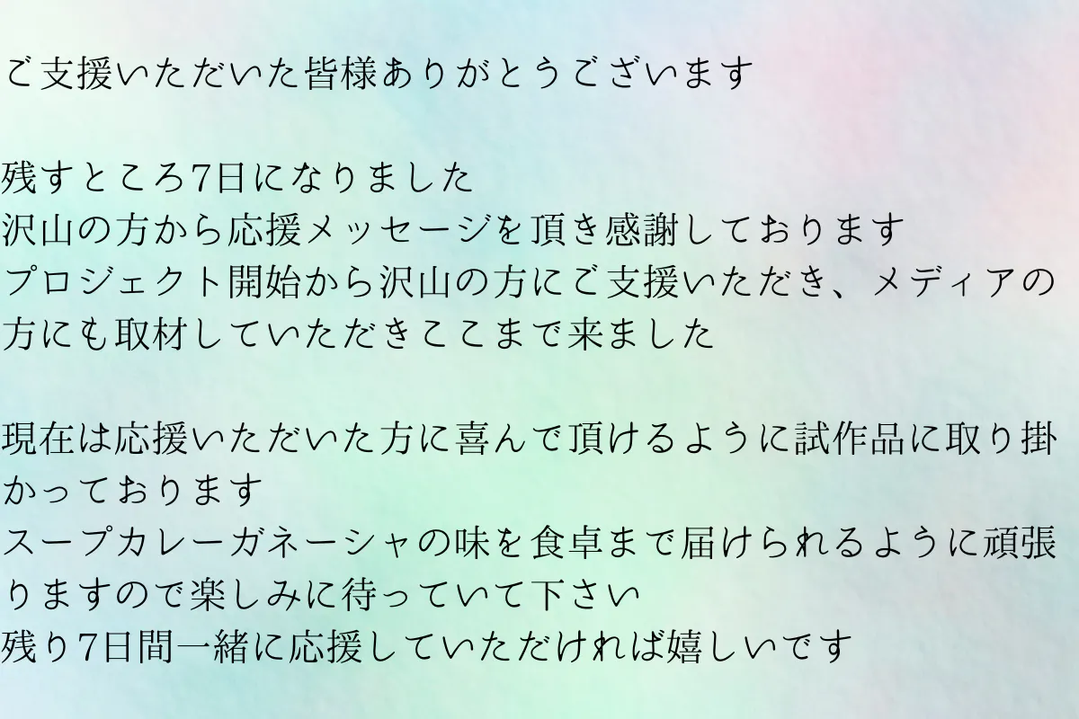 現在、週一度のお店をしていて、嬉しいことに多くのお客様から「めちゃくちゃ美味しい」と大変励まされるお言葉を頂いております。お客様のお言葉に勇気をもらいGaneshのスープカレーを全国に広めていくためにこのプロジェクトに参加しました。是非Ganeshの心を込めて作ったスープカレーを食べてみてください。応援よろしくお願いいたします。